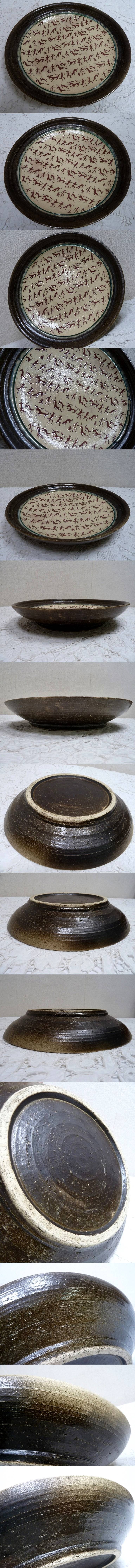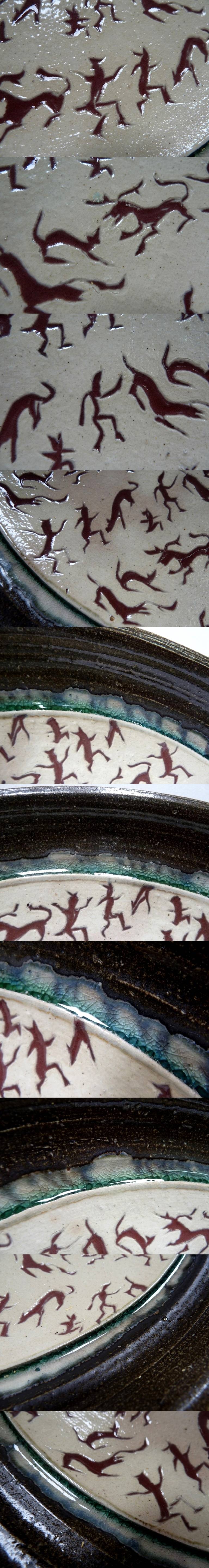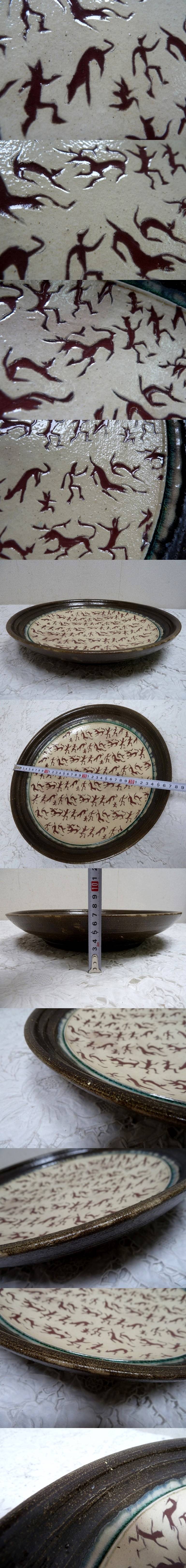 (☆BM)【最終大処分セール】旧家蔵出し品/大皿 陶器製 直径37.3㎝/2.6kg 動物/人 原始柄 和食器 飾り絵 絵皿 日本 アンティーク レトロ