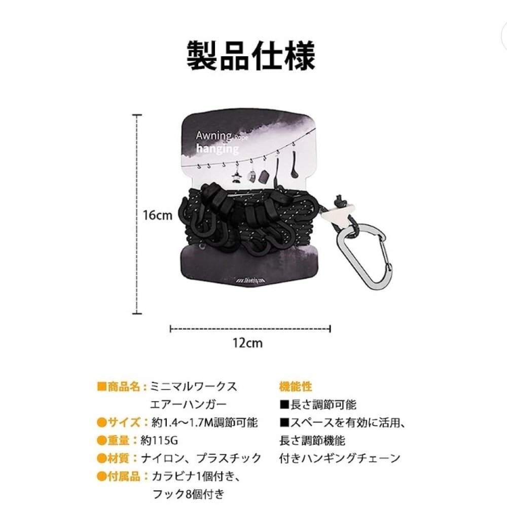 便利で用途多彩なハンギングロープです。 様々なシーンで大活躍ハンギングロープ! ランタンや食器など、かさばる小物をまとめて吊り下げてすっきり! 長さ調整自由自在!自分だけのこだわりのキャンプが楽しんで頂けたら幸いです。 ナイロンとポリエステルを使用し縫製で優れた耐久性を実現させました♪ ロープに反射材が含まれているため、夜間でも 自在金具でロープの長さを自由に調節してお使い頂けたら幸いです。 アウトドア BBQ 野外フェス など、様々なシーンで活躍してくれそうな見た目もおしゃれなハンギングチェーンです! 普段使いはもちろん 車中泊の際、室内干し 等 様々シーンでお使い頂けたら幸いです。 【商品詳細】 商品名 ハンギングロープ 材質 ナイロン、ポリエステル フック 8個ついております。 重さ 約81g 長さ 4.3m ロープ直径 4mm カラー レッド ※ レッド ブラック 2種類ご用意させて頂きました。コメント欄からお気軽にお申し付けください。 #ソロキャンプ #キャンプ #camp #camping #ハンギングロープ #イナキャップ #イナハンガー #ゴールゼロ #デイキャンプ #バーベキュー #BBQネット #物干しロープ #食器干し #キッチン #アウトドア #outdoor #レザーフック