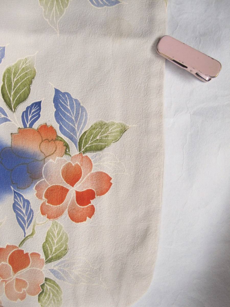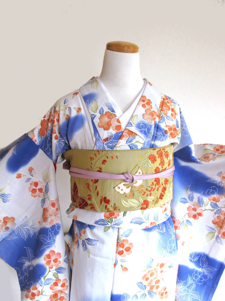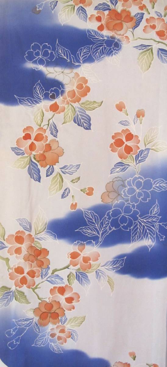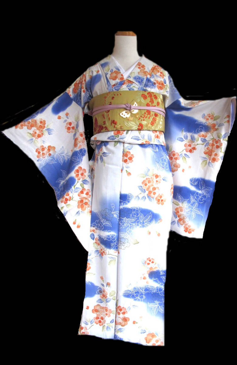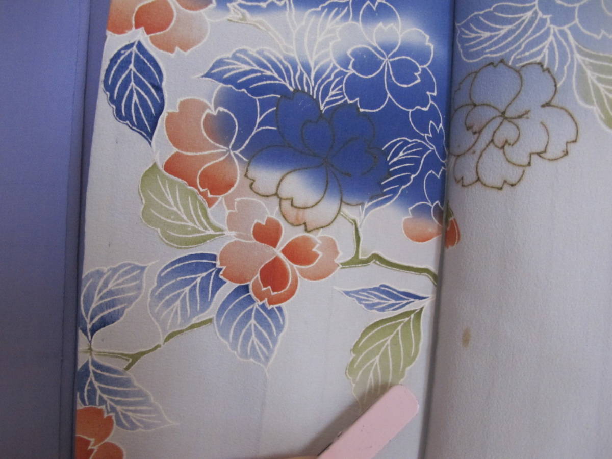 おおよその丈:身丈(肩)146.5cm、裄60.5cm、袖丈69cm、袖幅31cm、前幅22.5cm、後幅27.5cm 素材:正絹 お色:淡い水
