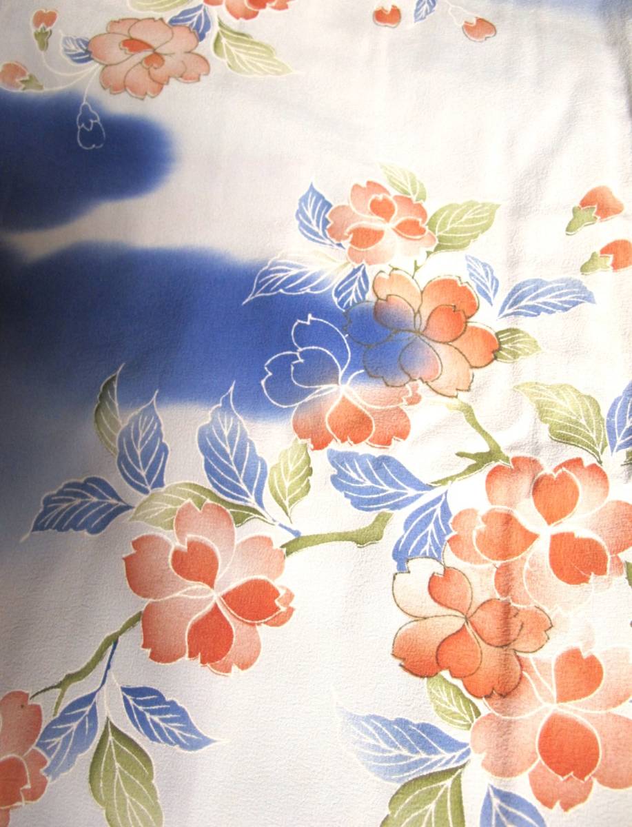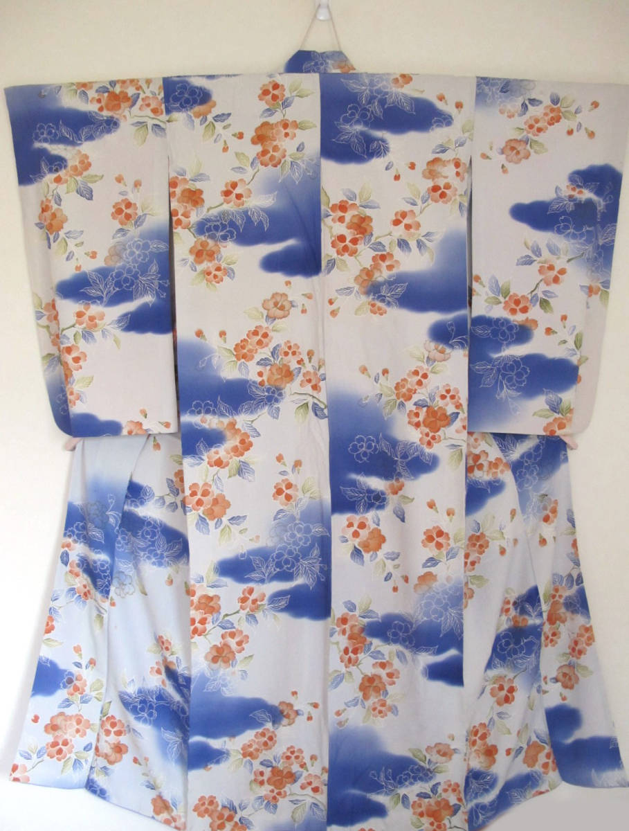 うららかな春の空気を感じる、桜に雲霞のアンティーク着物です。 錦紗地です。八掛は淡い青紫です。 |