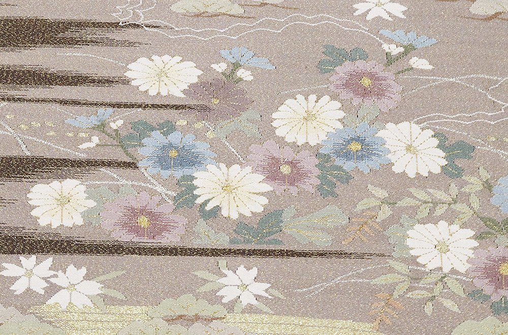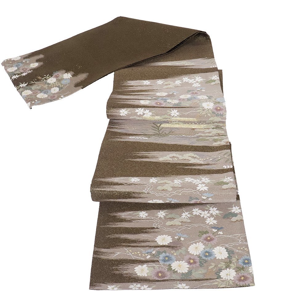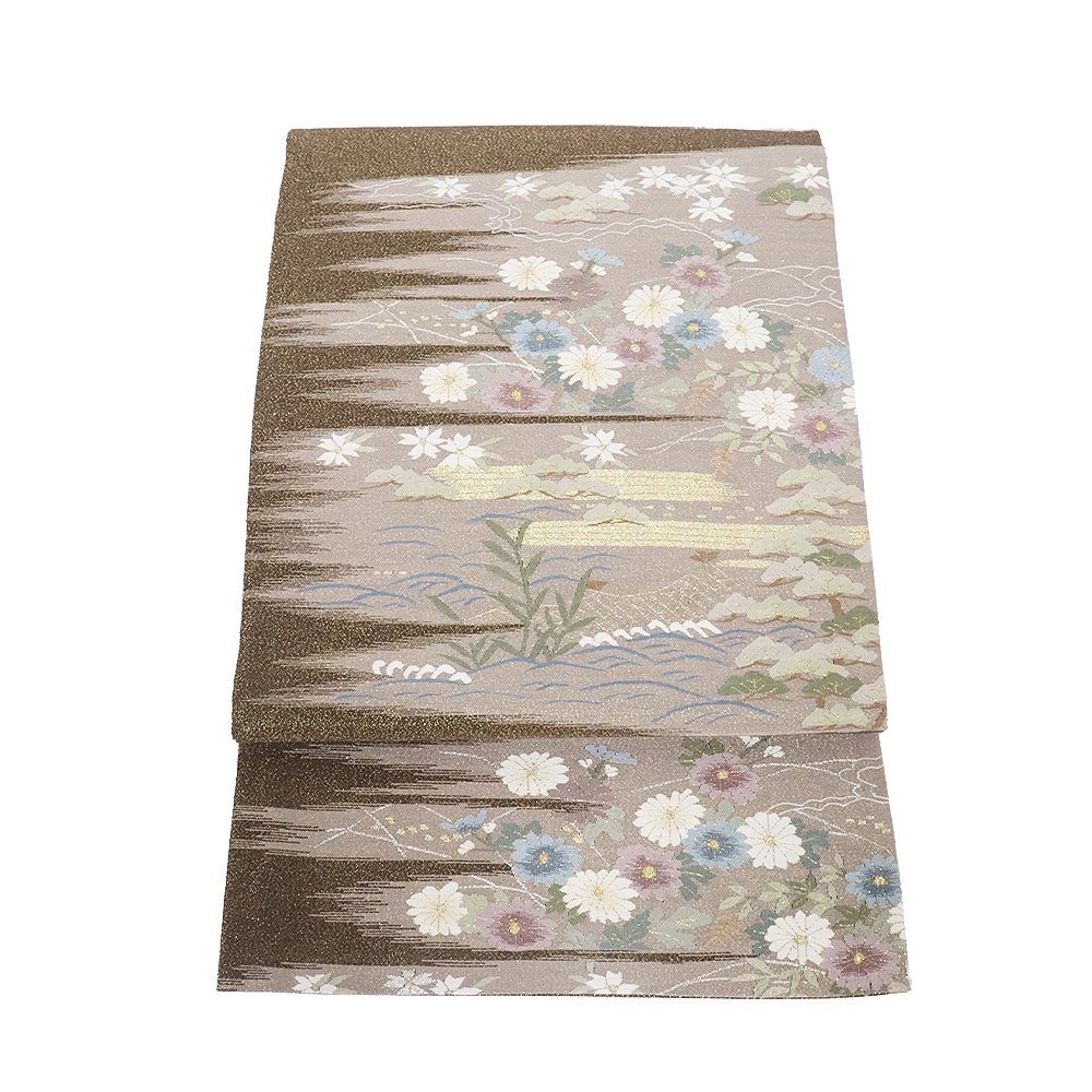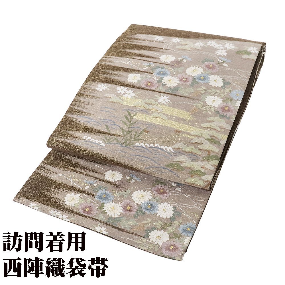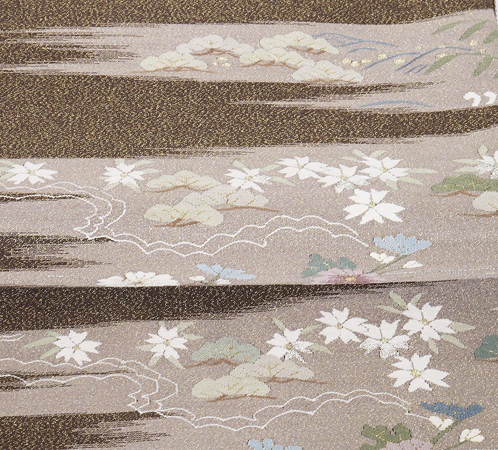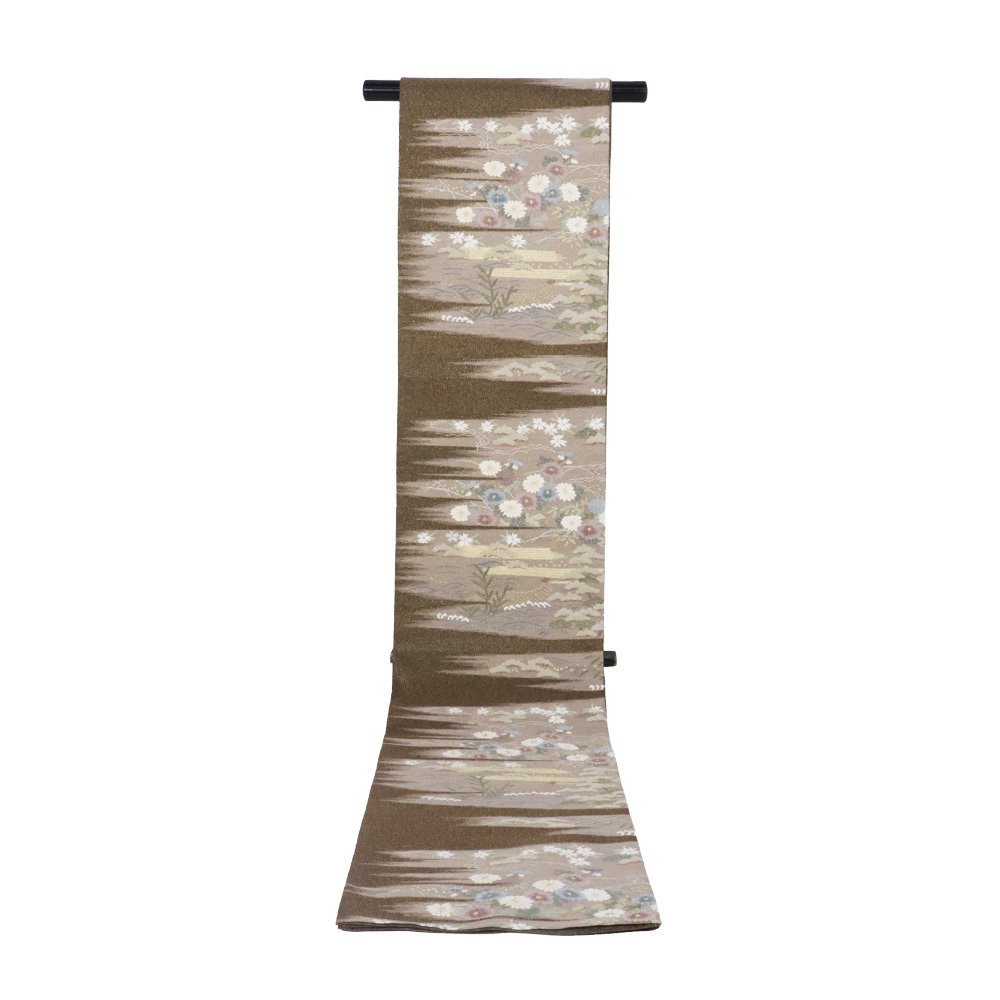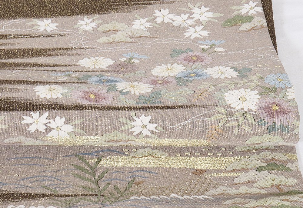 | 綴れ織袋帯 抹茶色・金糸通し地 桜・菊・松・笹 新品 仕立て上がり | |
