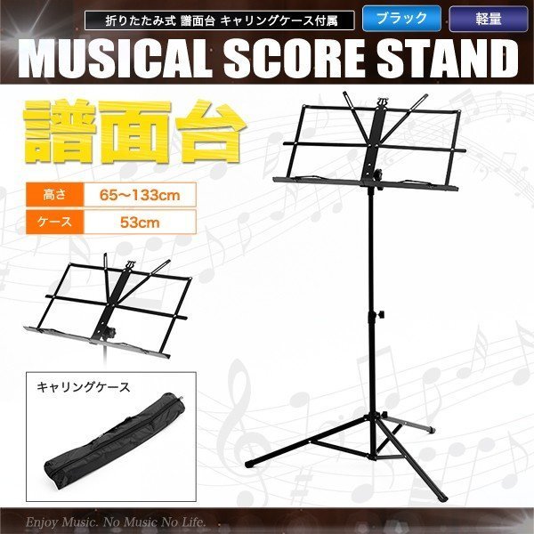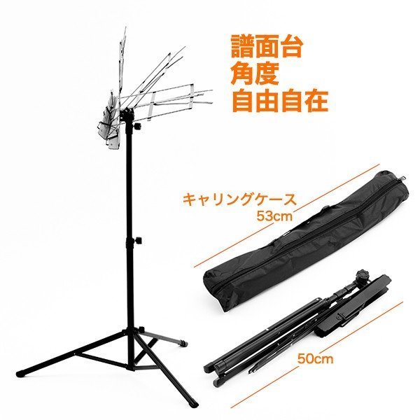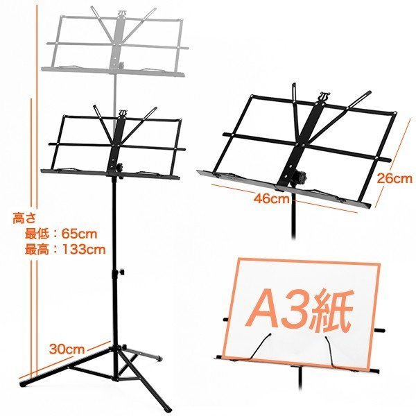 | サイズ | 全体寸法:高さ65~133cm 脚部半径:30cm 譜面台寸法:幅46cm 高さ26cm(およそA3用紙) ケース:全長53cm |