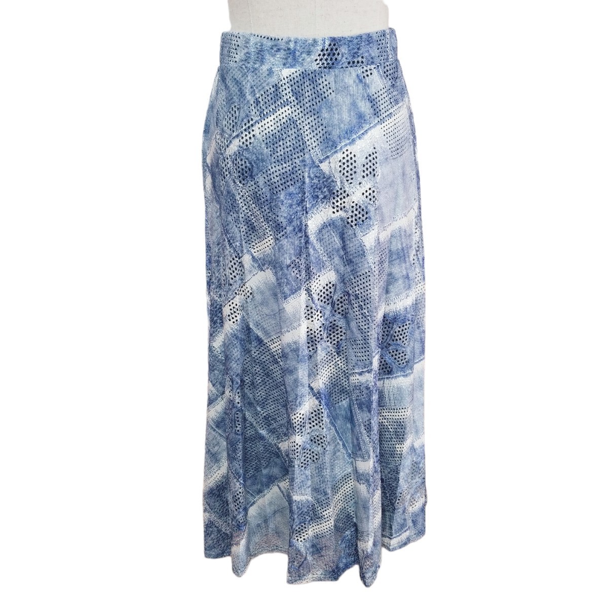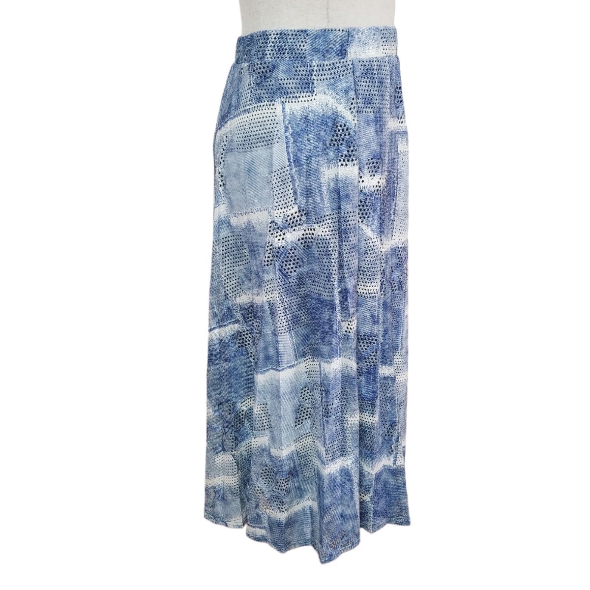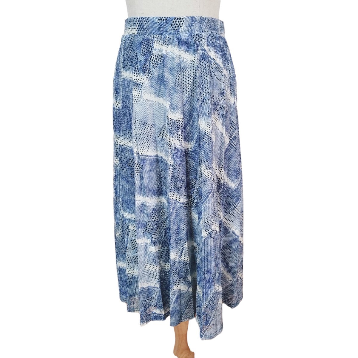 Y093 ウエストゴム ハイストレッチ パンチレース プリント プリーツスカート フレアスカート ロング丈 レディース M~L ブルー系 アート柄