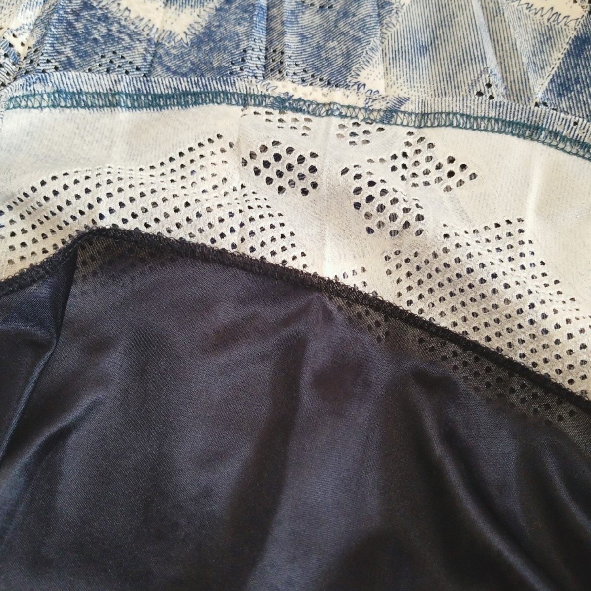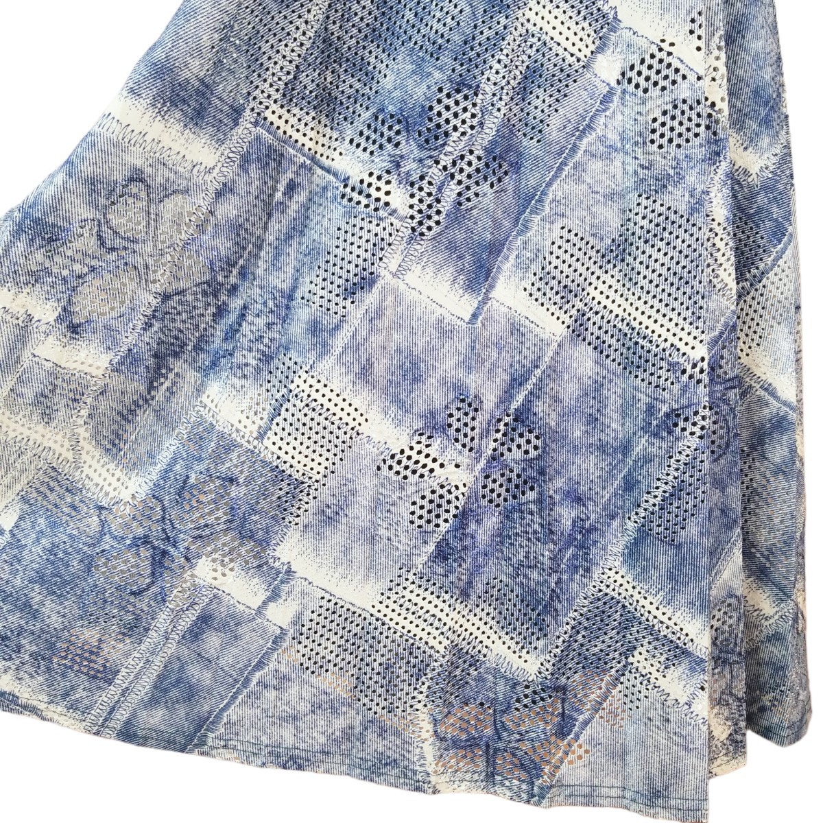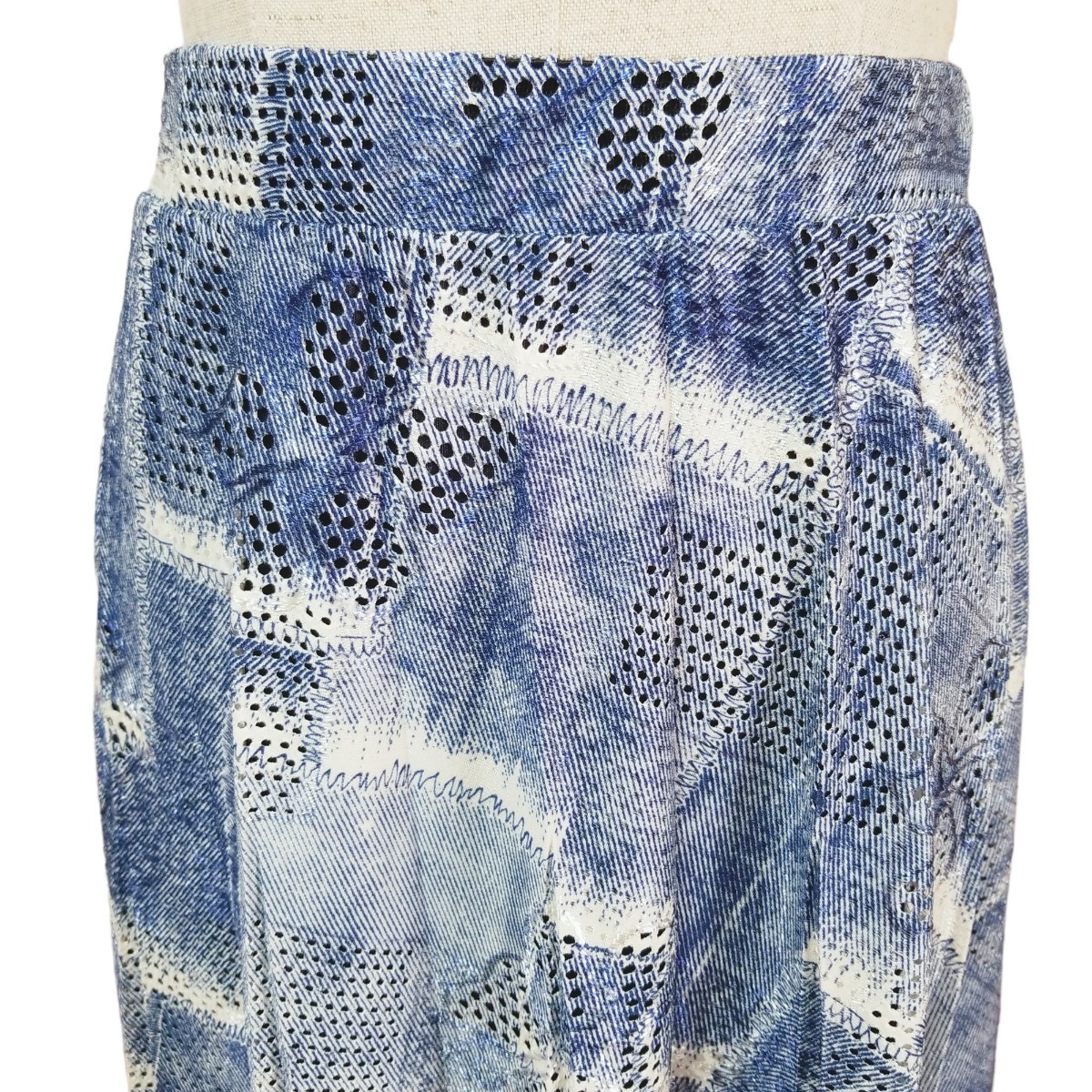 Y093 ウエストゴム ハイストレッチ パンチレース プリント プリーツスカート フレアスカート ロング丈 レディース M~L ブルー系 アート柄