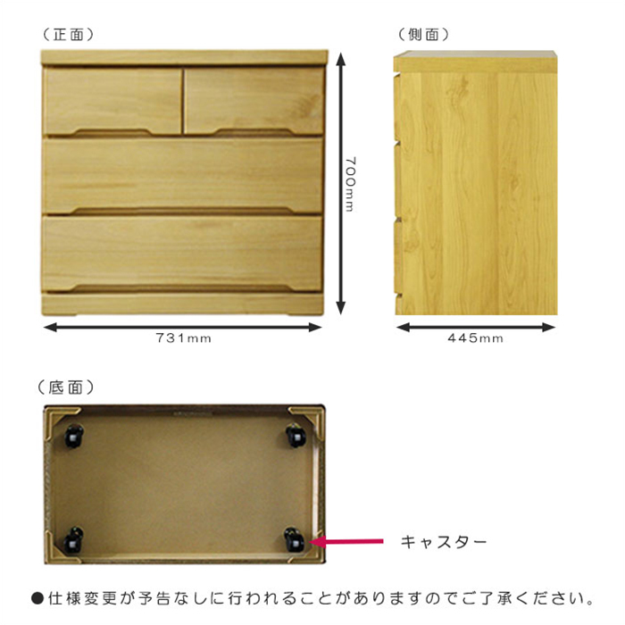 特  徴幅73cm桐材を使った、国産ローチェストです。引き出しは頑丈な箱組み。取り付け式の隠しキャスター付きです。