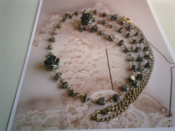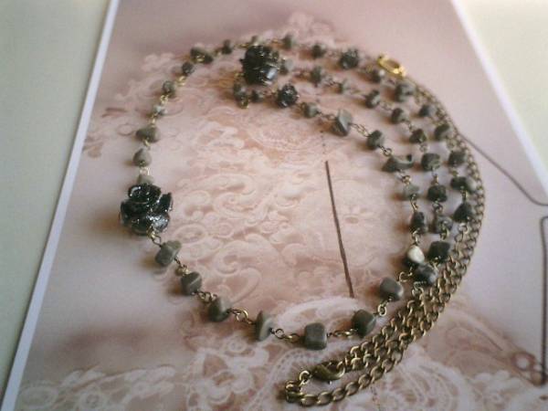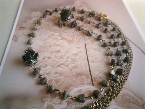 ジャンヌの幸せ・・シリーズです♪セピア色の薔薇・・シックなグレーオニキスのネックレスです♪可憐な樹脂薔薇を合わせて大人のロマンチックしています♪グレーオニキスは7ミリから9ミリ位までのさざれです♪18ミリ、12ミリの樹脂薔薇を合わせました♪長さは全長115センチ位で調節自由です♪2連にされても素敵です♪お揃いのブレスレットも出品しています♪ハンドメイドをご理解いただいたノークレーム・ノーリターンでお願いします♪