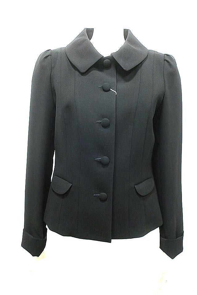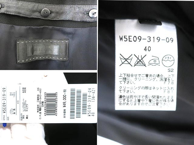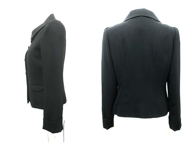 こちらは未使用品です。定価49000円です。襟部分が取り外し可能で、ノーカラーにもできます。マットな質感のジャケットなので、冠婚葬祭にもお使いいただけます。