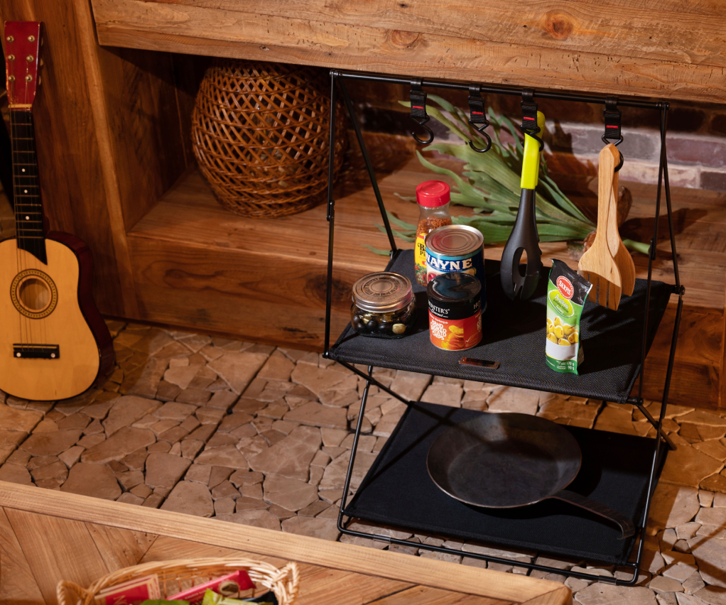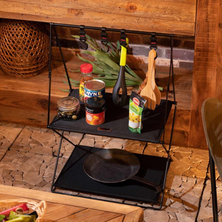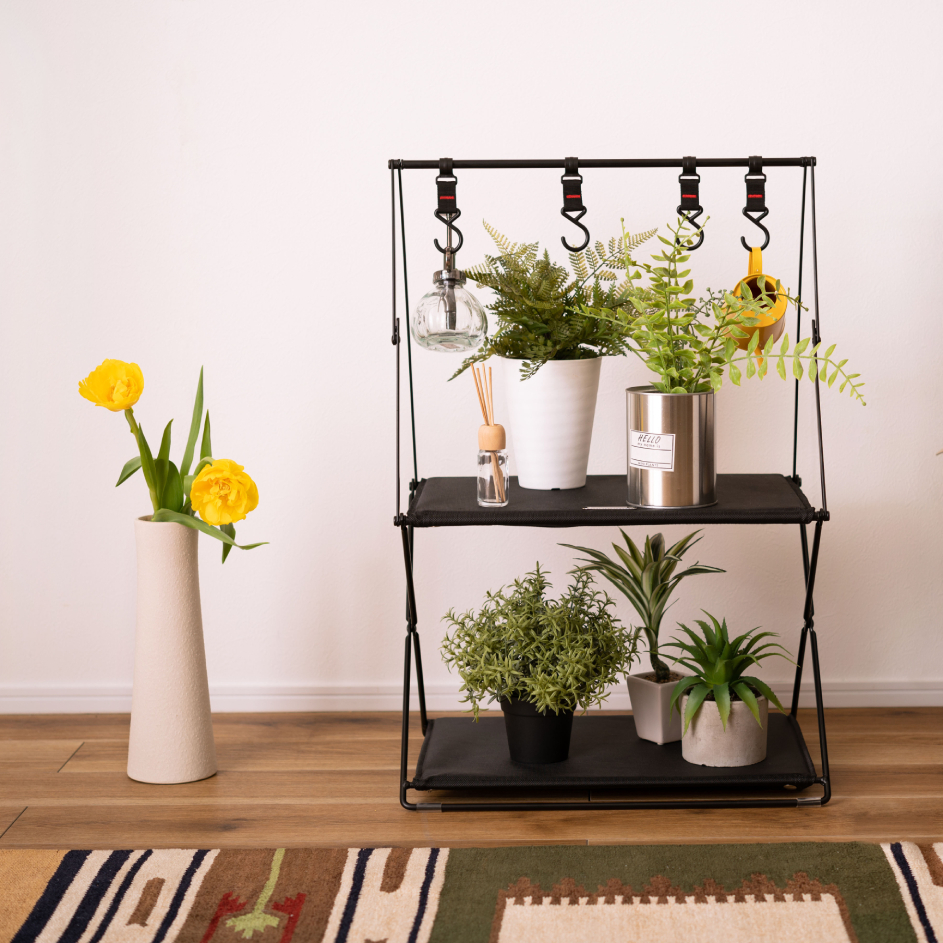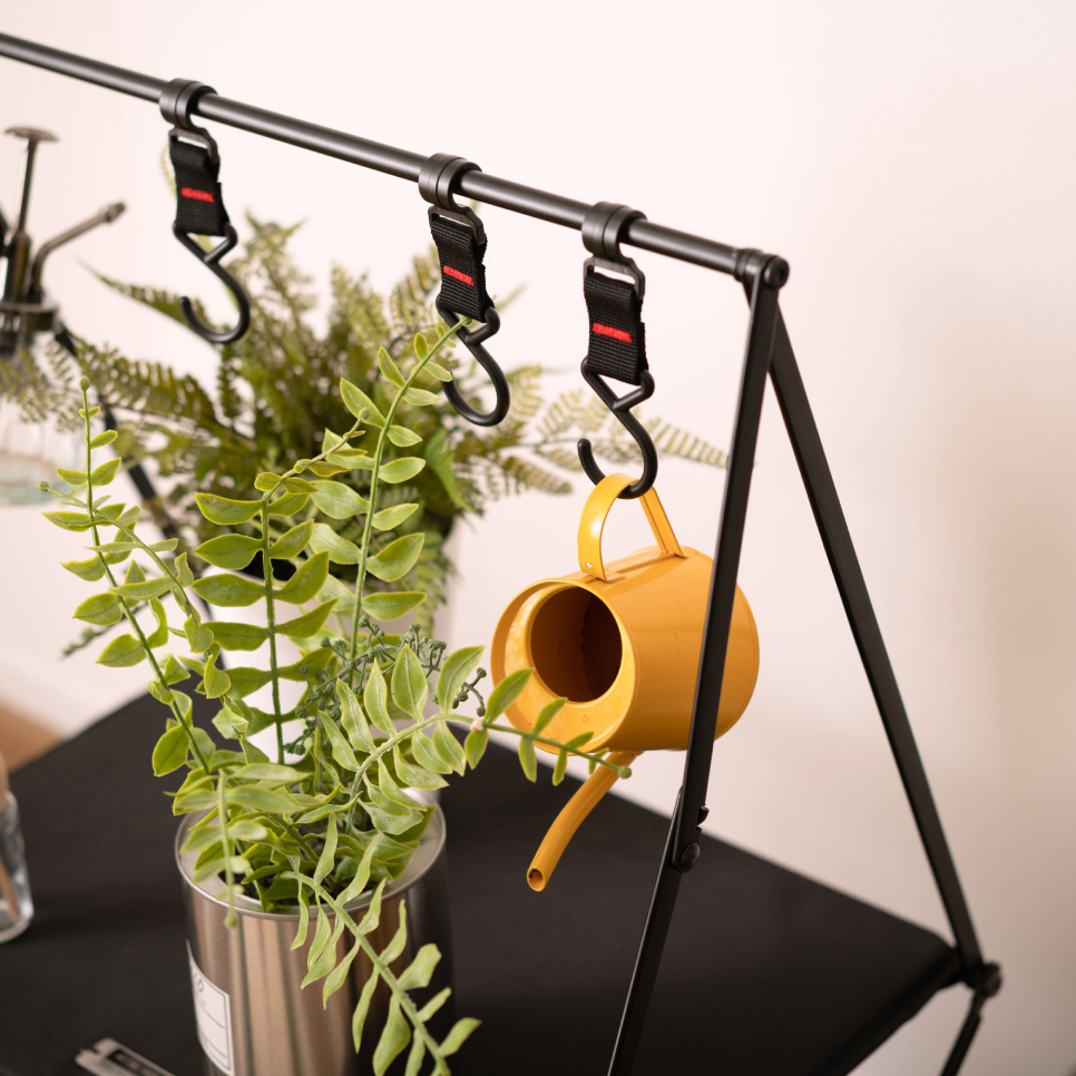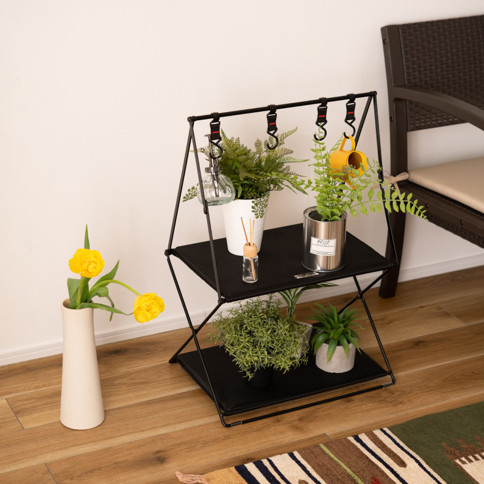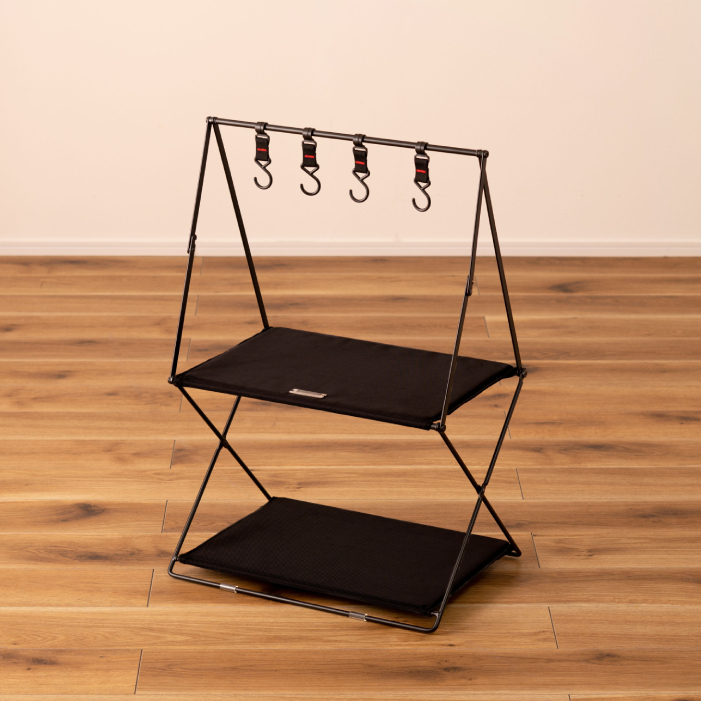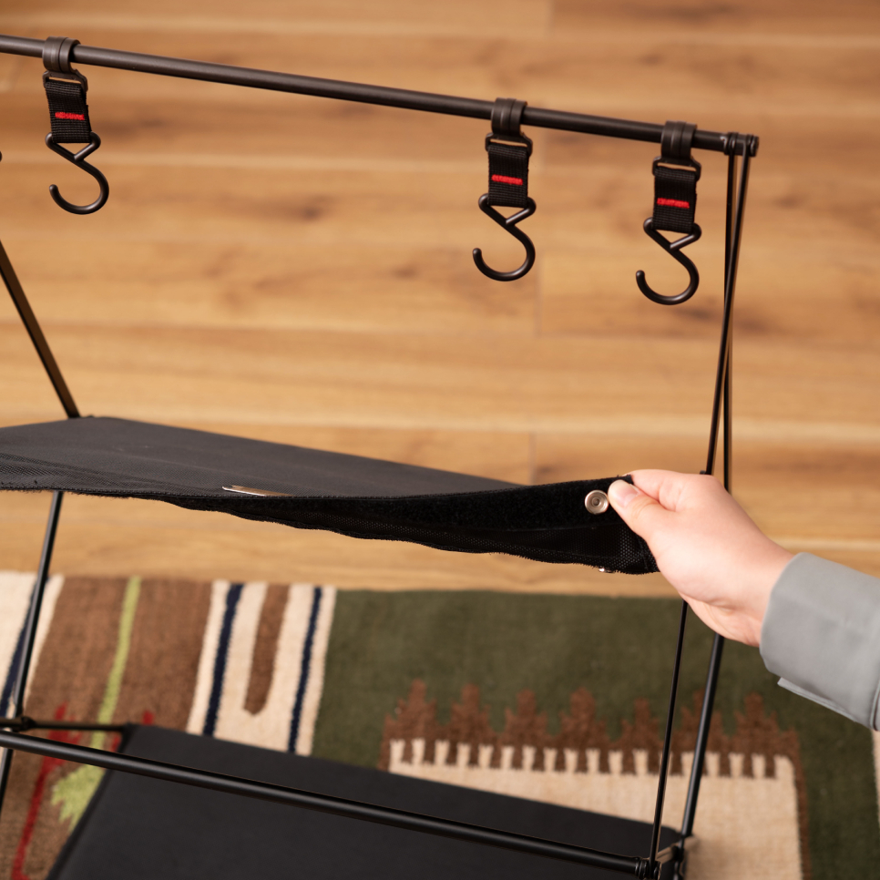 キャンプからお部屋空間の収納におすすめな、おしゃれなハンギングラックはいかがでしょうか? 棚にはキャンプ道具から雑貨、フックにはキャンプ用食器や小物など引っ掛けて収納できる便利なアイテムです。 アウトドアでは小型ギアを一箇所にまとめられるので、キャンプや室内で大事な小物をなくす心配がありません。 荷物整理に便利!小型キャンプギアを掛けて収納ができる。 トップバーに吊るして使うフックに、キャンプで使うランタンや焚き火ギア、シェラカップやキッチンツールなど散らかりがちな小物類を吊して整理できます。 焚き火の近くに置けるスチール製 スチール製のハンギングラックは、耐久性が高く熱に強いのが特徴です 焚き火の近くで使えるほか、火吹き棒や手斧、重さのあるスキレットなども吊るせます。 軽量で折りたたみも簡単に行えますので、持ち運びや収納が楽に行えます。 ※取り外しフック4本付き [スチールについて] スチールにはハンマーストーン仕上げ[粉体塗装加工]を施していますので、艶を抑えた味わい深い見た目が表現されています。 |