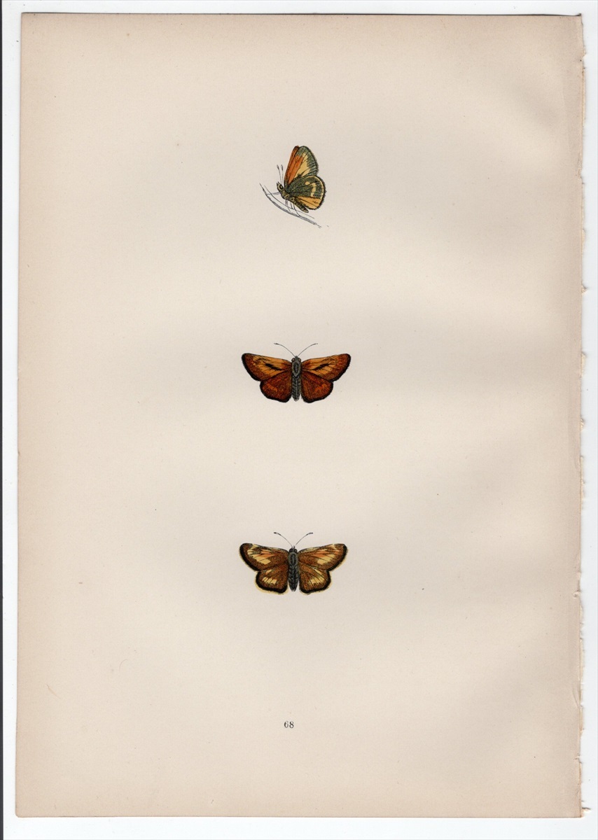 1890年 Morris 英国蝶類史 木版画 手彩色 Pl.68 セセリチョウ科 コキマダラセセリ属 LARGE SKIPPER 博物画