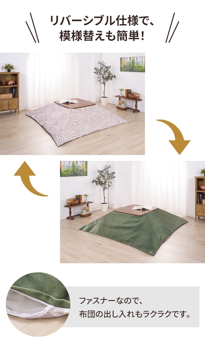 | リバーシブルに使えるこたつ布団カバー。 お部屋の雰囲気や気分で手軽に使い分け、インテリアとのコーディネートも楽しめます。 お持ちのこたつ布団にすっぽりかぶせてファスナーを閉めるだけの簡単装着。 ファスナーはカバーで隠れる仕様になっているので、床を傷つけにくく、踏んでしまってもけがをする心配がありません。 |