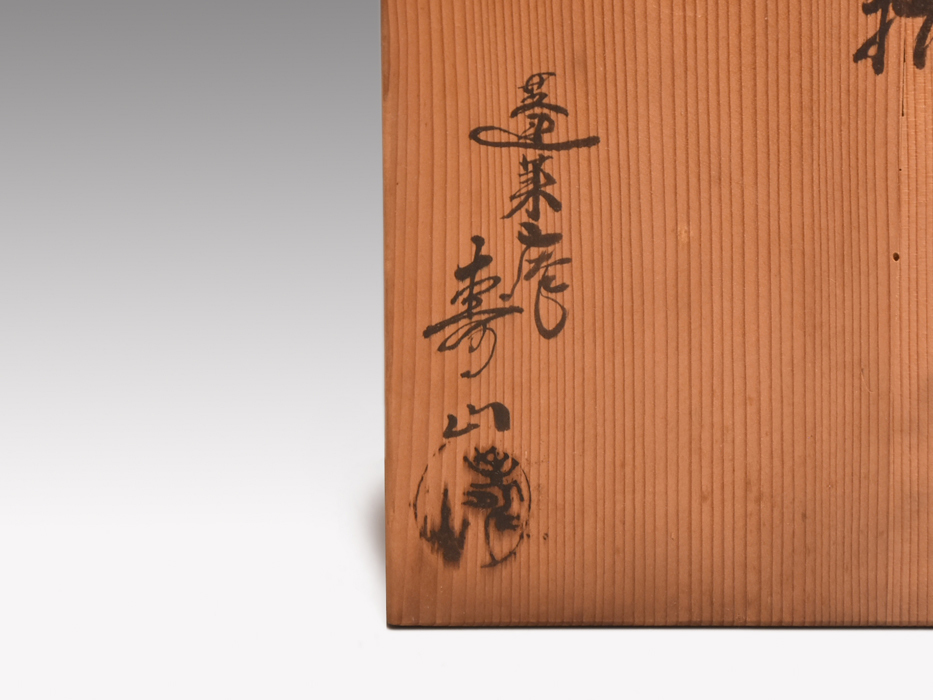 本物の南蛮水指かと思わせる出来の水指です。 轆轤目を見せ正面を押して変化を付け自然釉薬が掛かり詫びた風情の水指です。 底に「寿山」の銘が彫られております。 蓋も共蓋と塗蓋が備わっております。 キズ欠点なく良い状態です。 ※撮影の際に生じた写り込みなどがございます。 ご理解の程よろしくお願い致します。 |