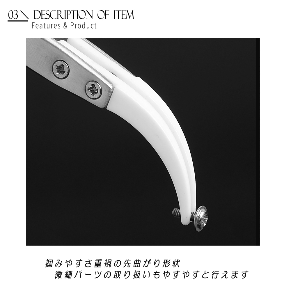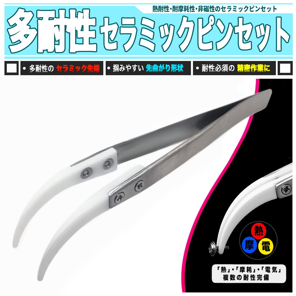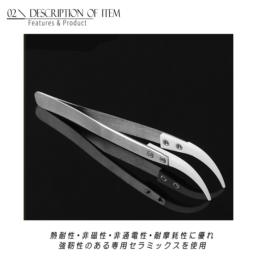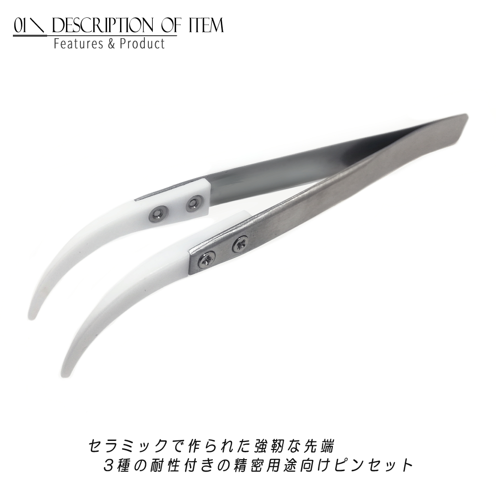 様々な特殊作業に対応ができる 複数の耐性を備えたセラミックピンセット。 耐熱 / 非磁性 / 耐磨耗性 / 耐弱酸性 等 多くの耐性を持つセラミックの先端。 熱や電気などリスクが伴う場合の作業を 細かく安全に行うことが可能です。 先端がカーブ状に曲がっているため 部品を滑らすことなく安定の掴みやすさを実現。 繊細な技術を要求される場面でも、 正確に精密な作業が行なうことができます。 耐性が必要な作業向けの、 精密作業用のセラミックピンセットになります。 | |