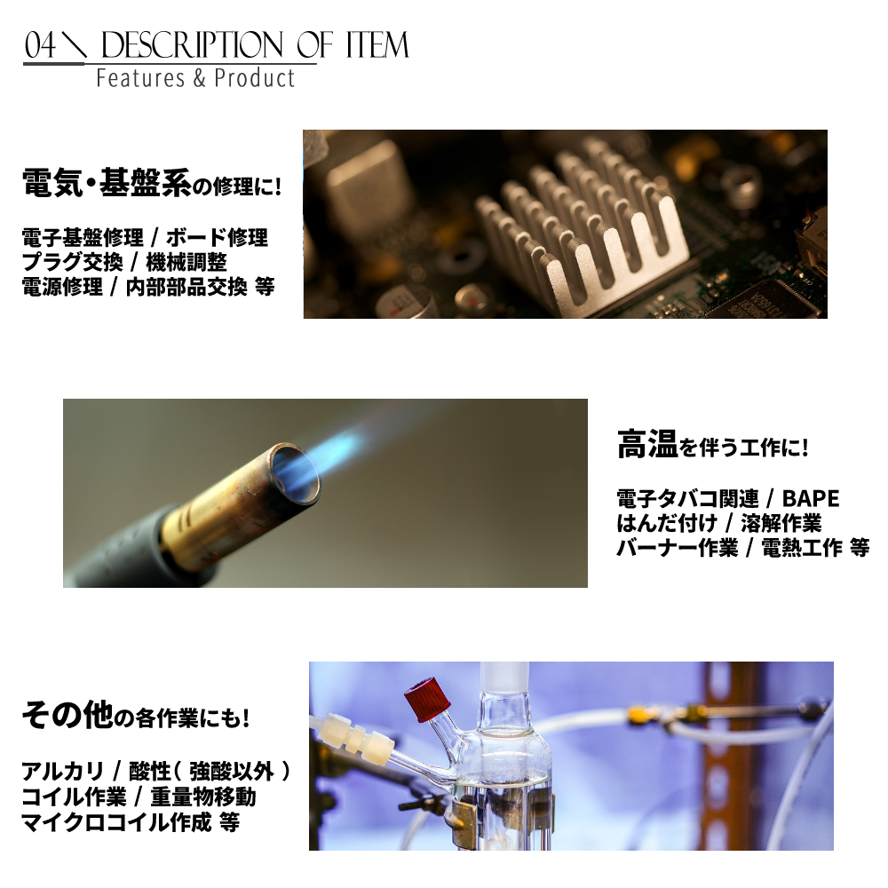 電気製品回路 / 半田付け / 熱部品の扱い | マイクロコイル / VAPE / 電子タバコ ホットスポット除去 / ロウ付け / 半導体の組立 など... 通常のピンセットで行うことが難しい 様々な精密作業にお使い頂くことができます。 内容の疑問や質問については 遠慮なく御質問をお願い致します。 |