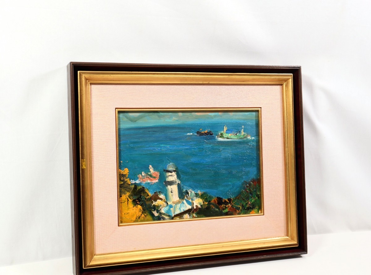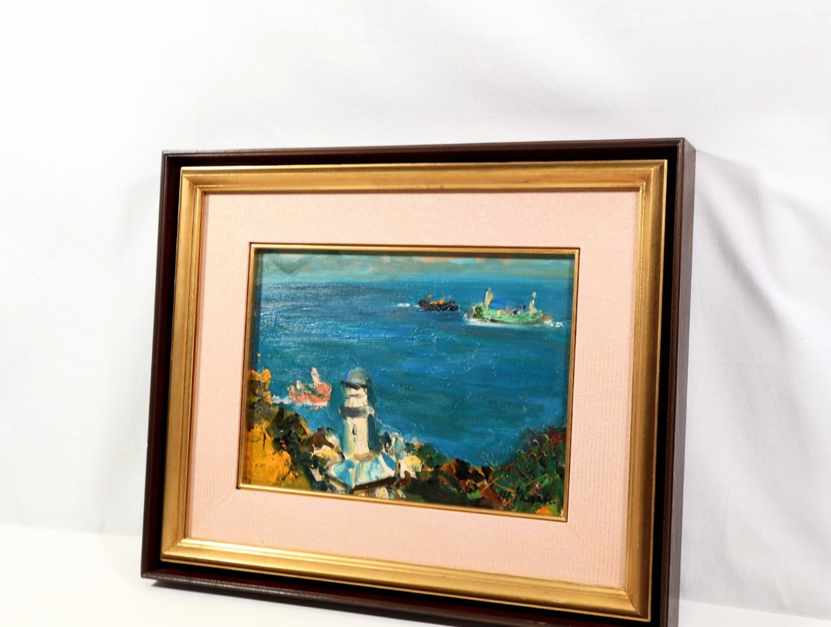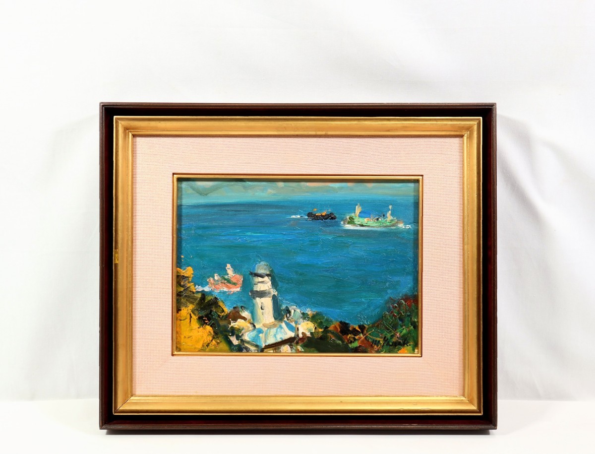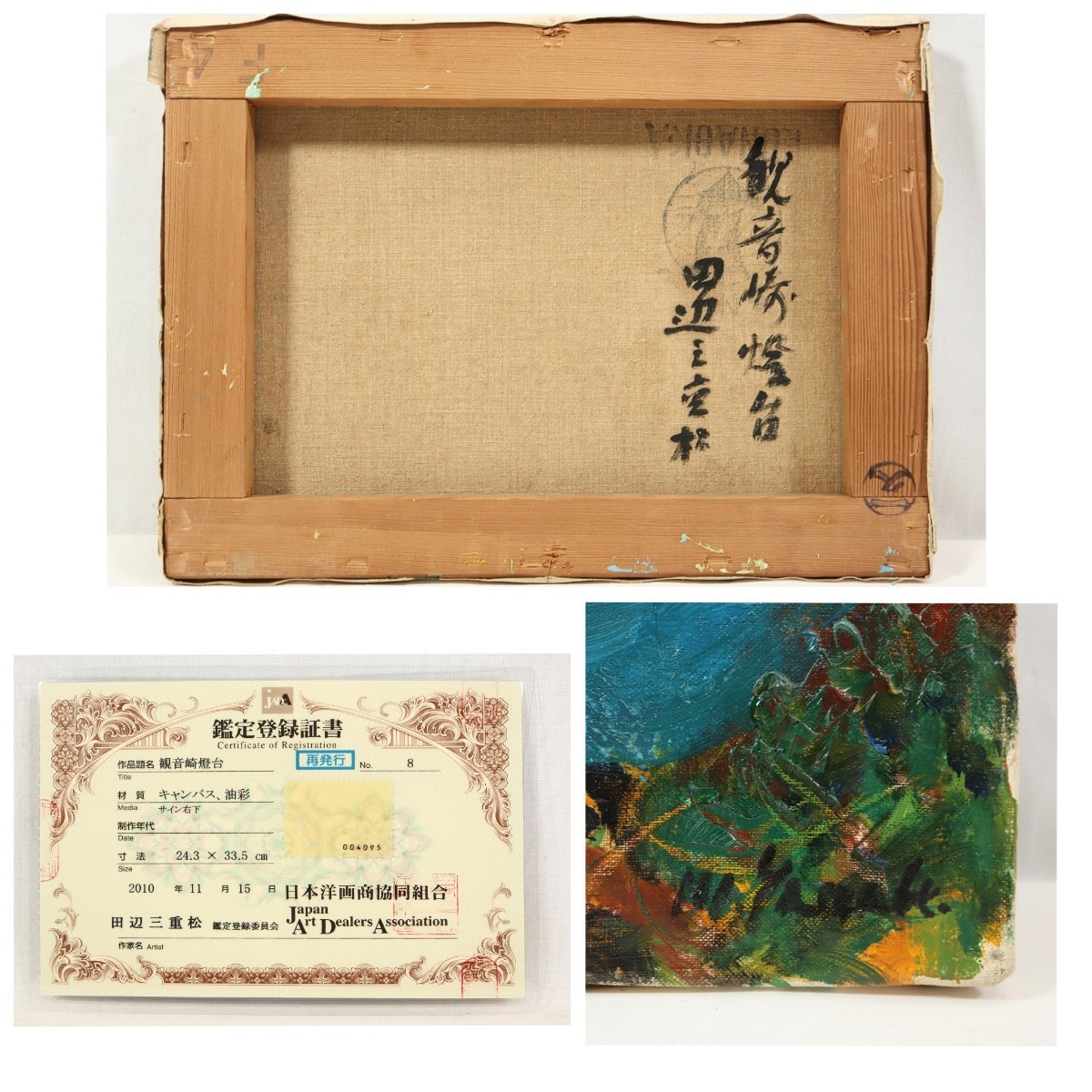 真作 田辺三重松 油彩「観音埼燈台」画寸 F4 北海道出身 行動美術協会創立会員 安井曾太郎に師事 浦賀水道が広がるダイナミックな構成 6613