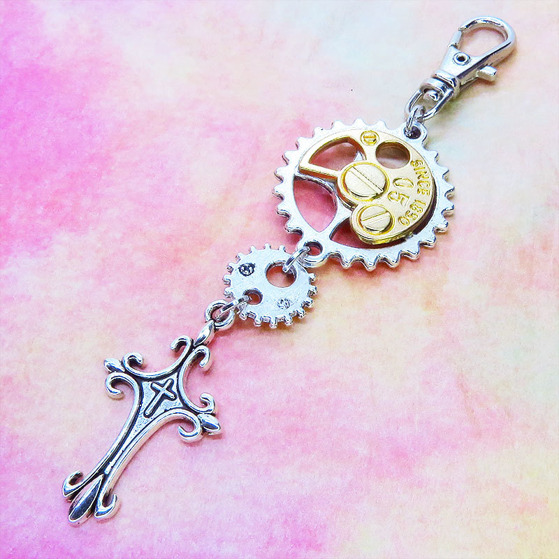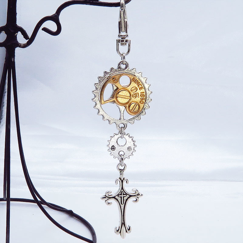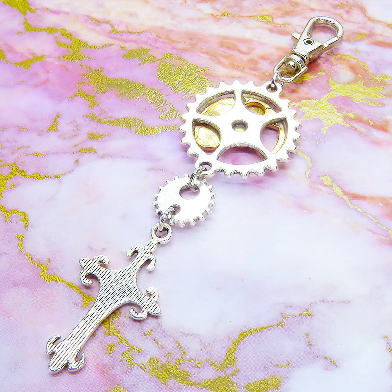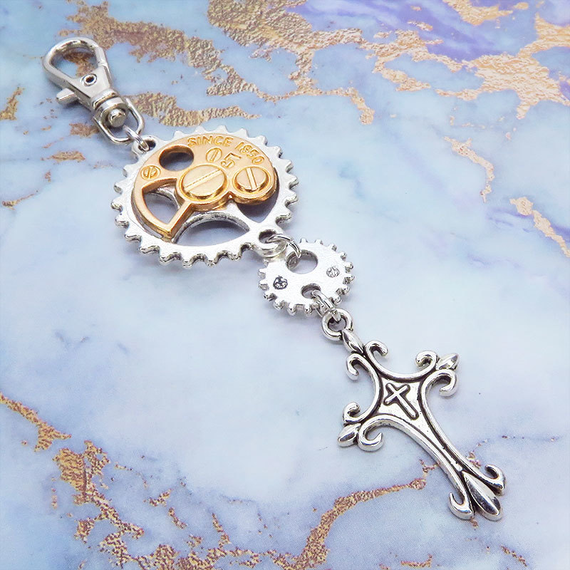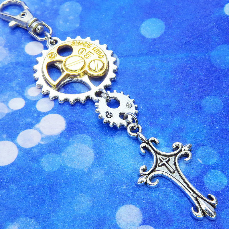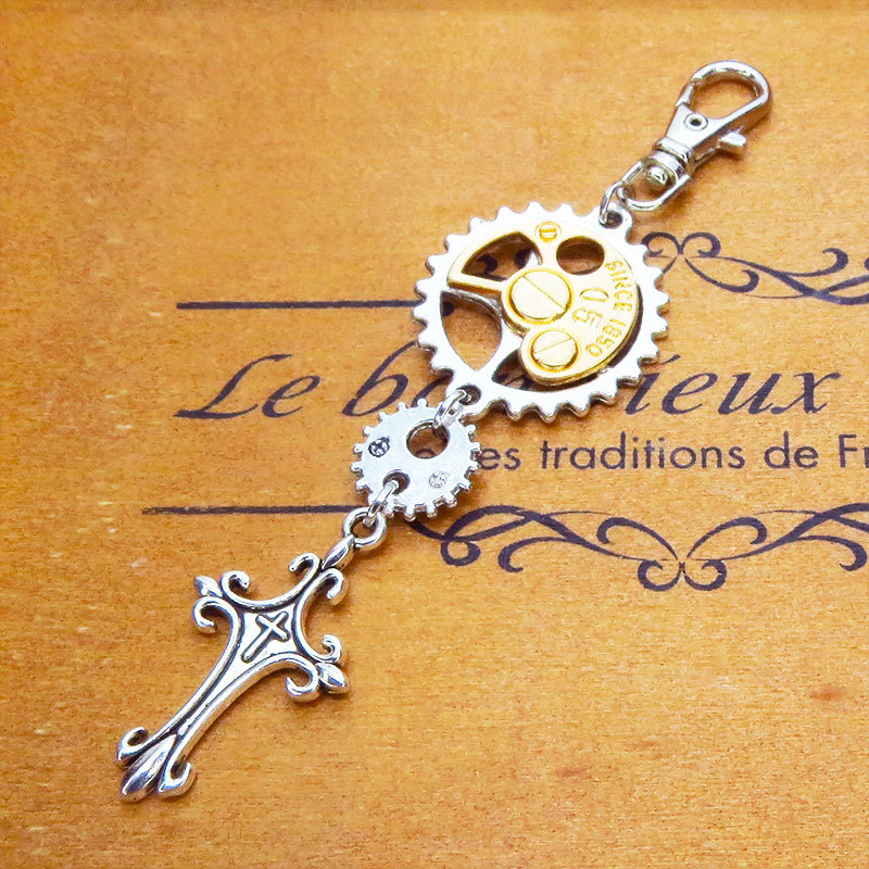 スチームパンク風アンティークシルバーの歯車とロザリオのキーホルダー チャーム バッグチャーム 金具変更可