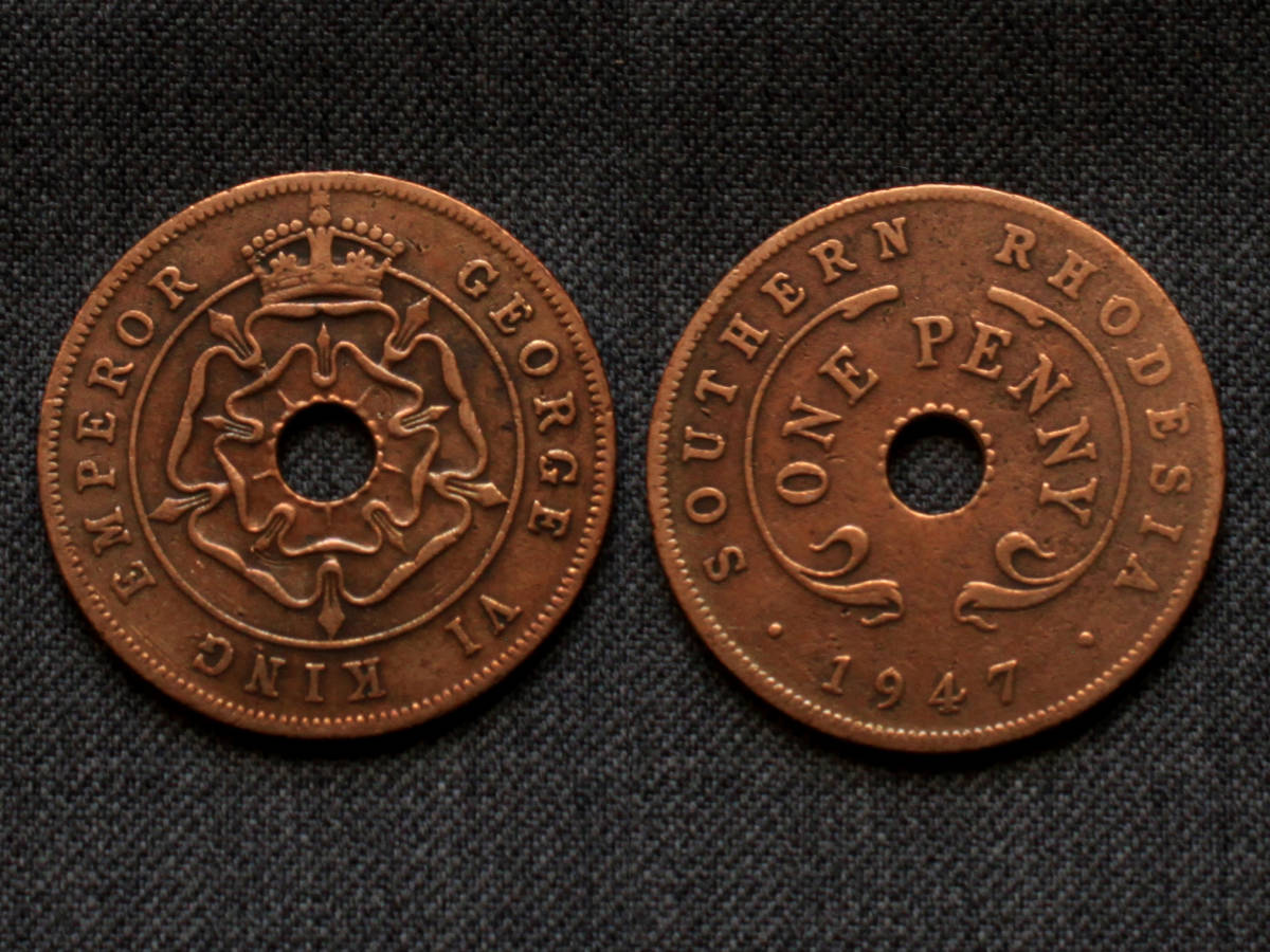 【南アフリカ】 1 ペニー 1947 年 南ローデシア ジョージ6世 チューダーローズ クラウン 銅貨 Penny