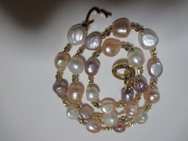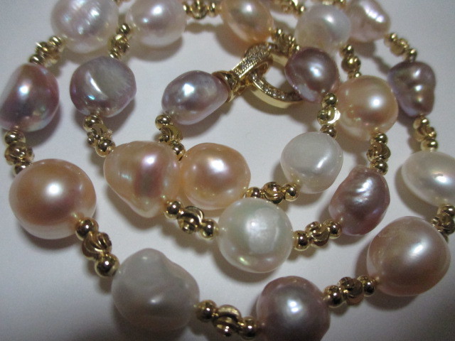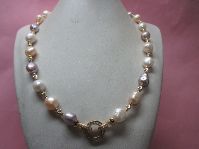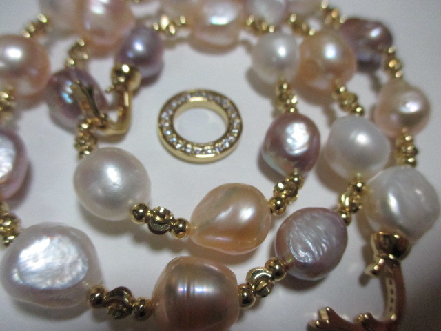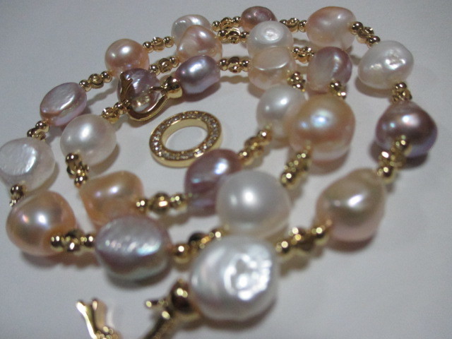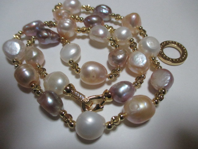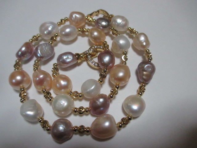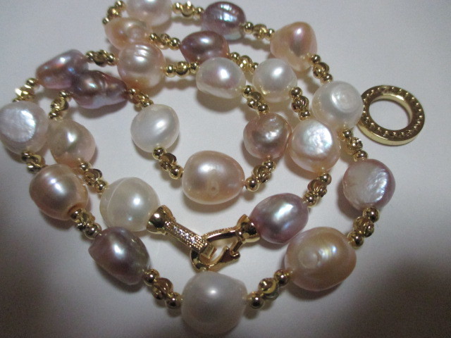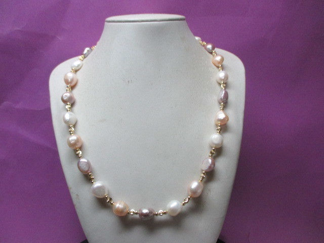 ★新品楽しめる南洋バロックマルチほぼピンクパープルホワイトなどの間にゴールドのビースがファッショナブルネックレスです♪