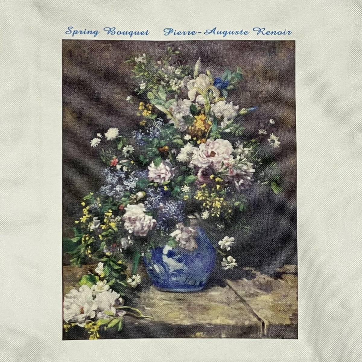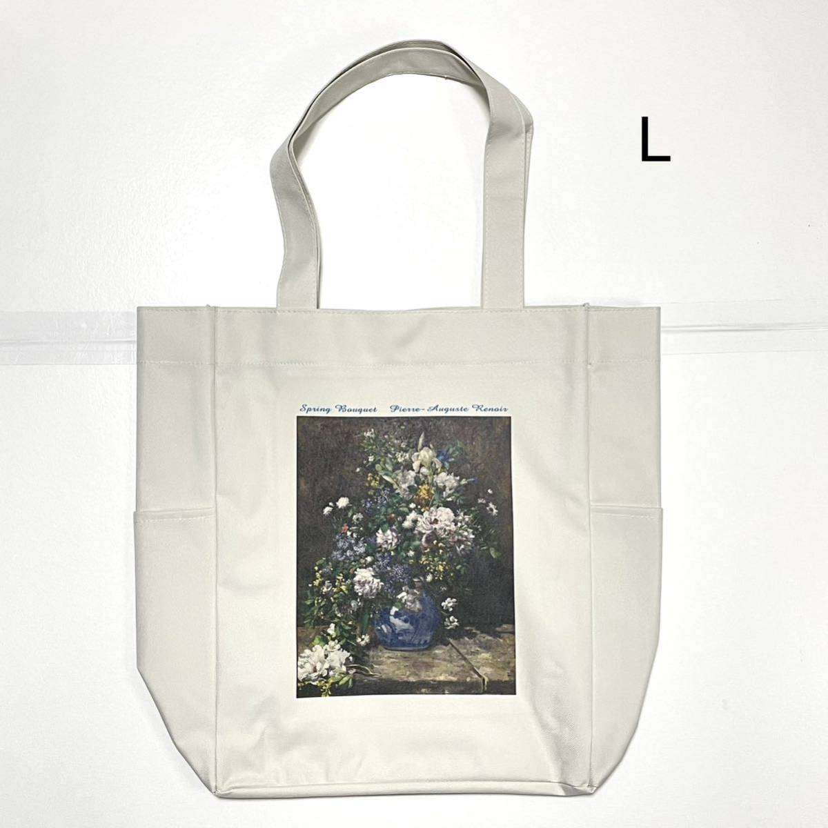 ルノワール の、春のブーケの絵を美しくプリントした、サイドや内側にポケットの付いた、水濡れに強い丈夫なポリキャンバス生地の大きめのトートバッグ、Lサイズです。