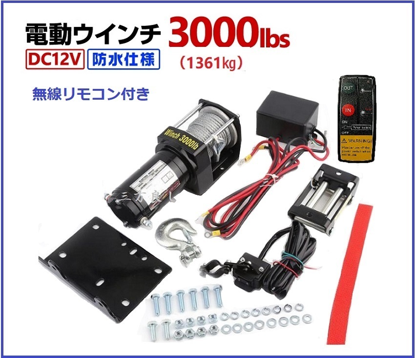 電動ウインチ 12V 3000LBS(1361kg)無線/有線リモコン付き 電動 ウインチ オフロード車 トラック SUV車(ZeepやFJクルーザー等) 防水仕様