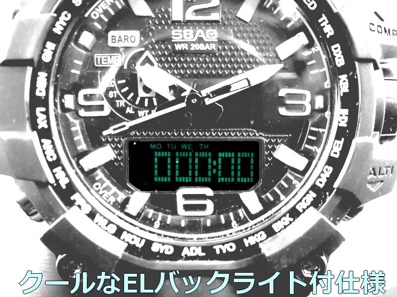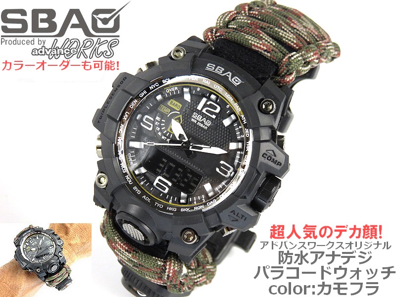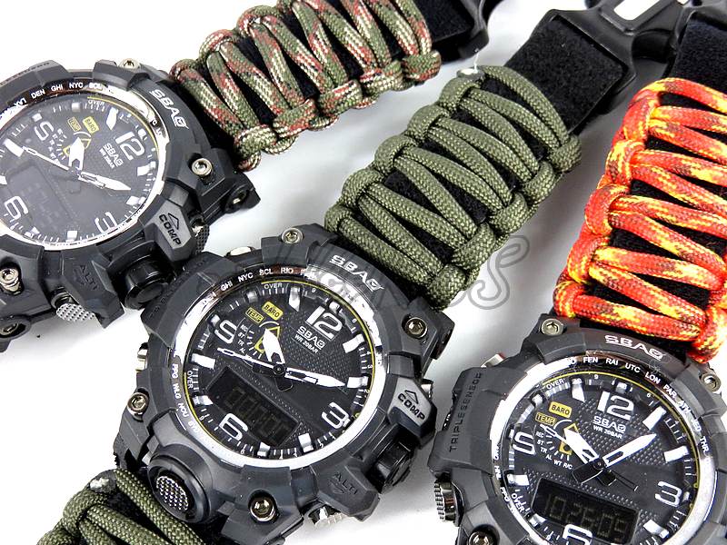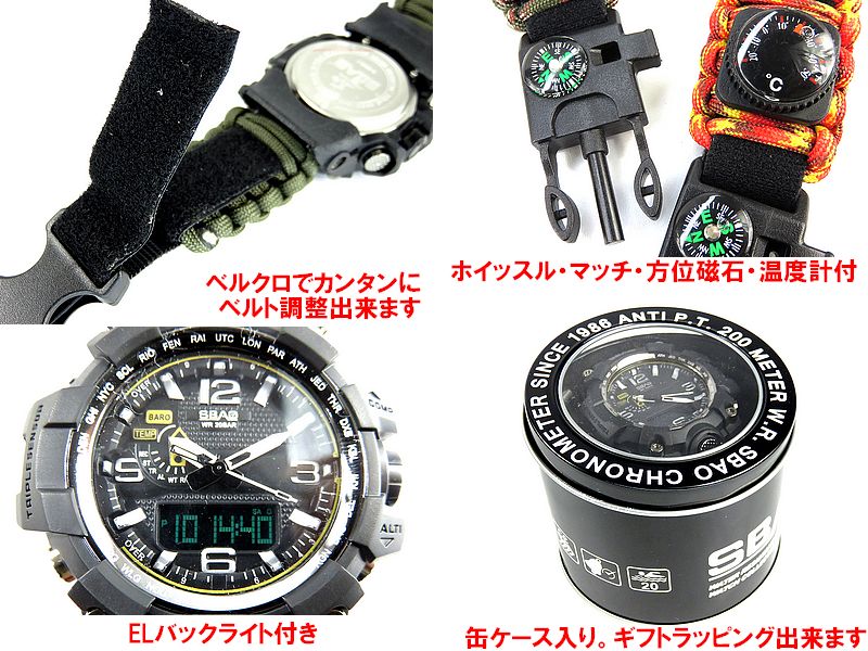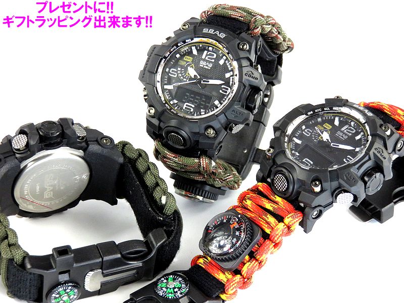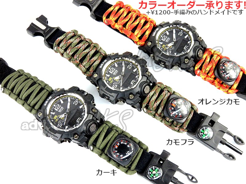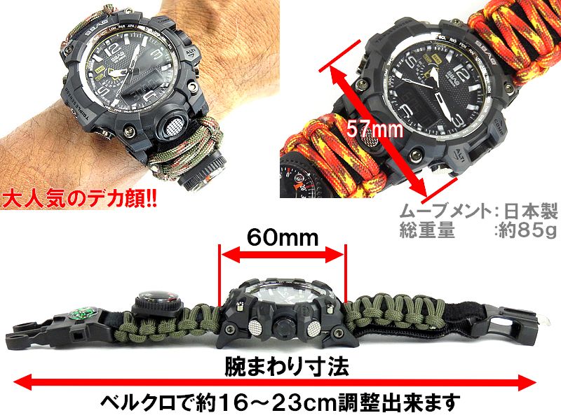 パラコードサバイバルウォッチ腕時計ミリタリーデジタルアナログ【カモフラグリーン】方位磁石ナイフファイヤースターター温度計笛付
