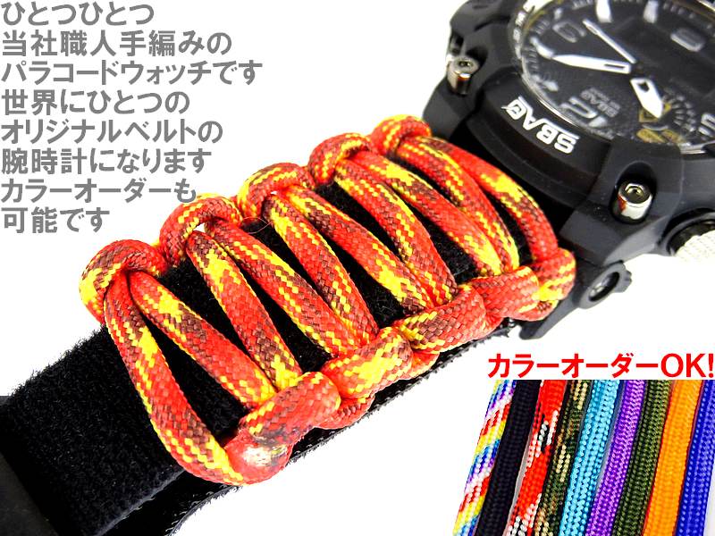 ベルト部分にはアウトドア派の必須アイテムパラコードを編み込んでありますので