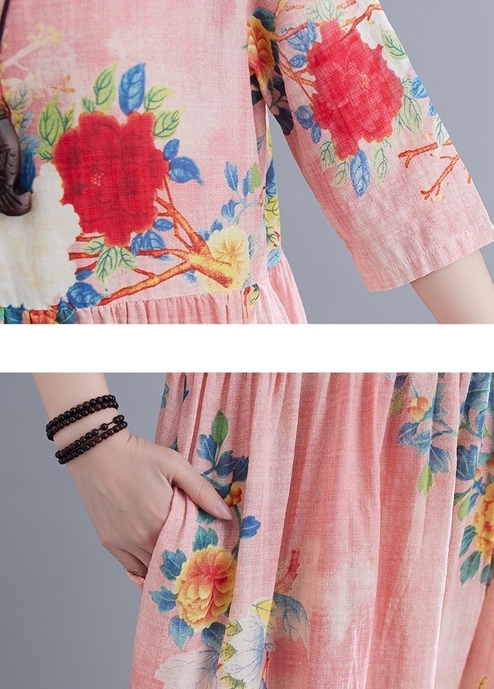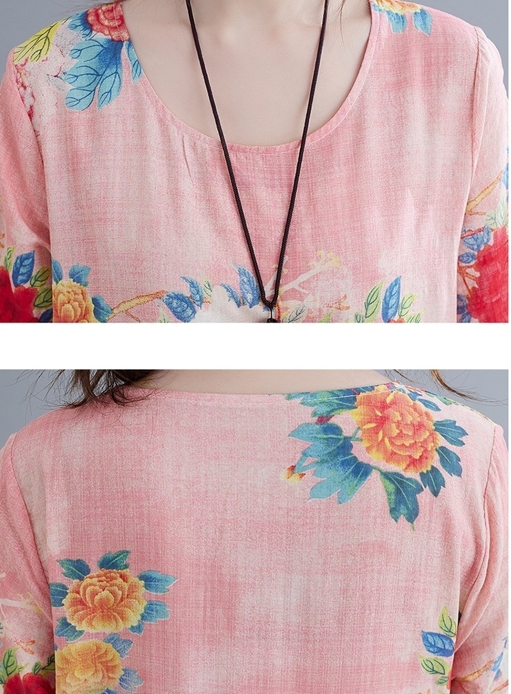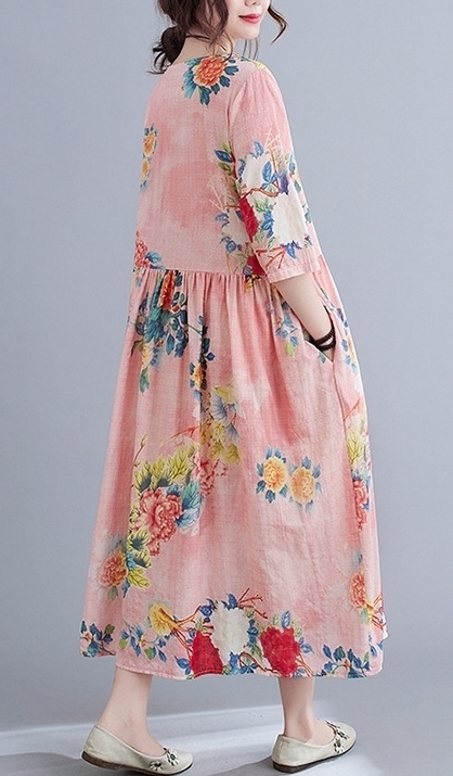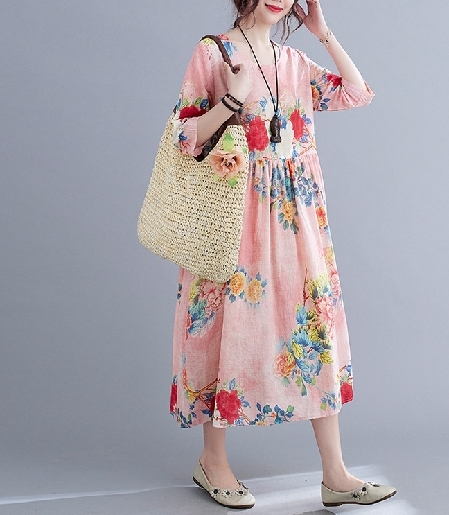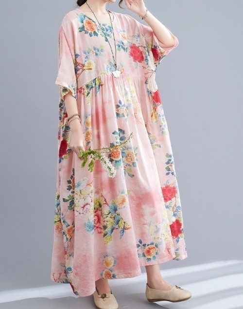 H925★ピンクお花柄がかわいい 大きいサイズ マキシ丈薄手コットンワンピ