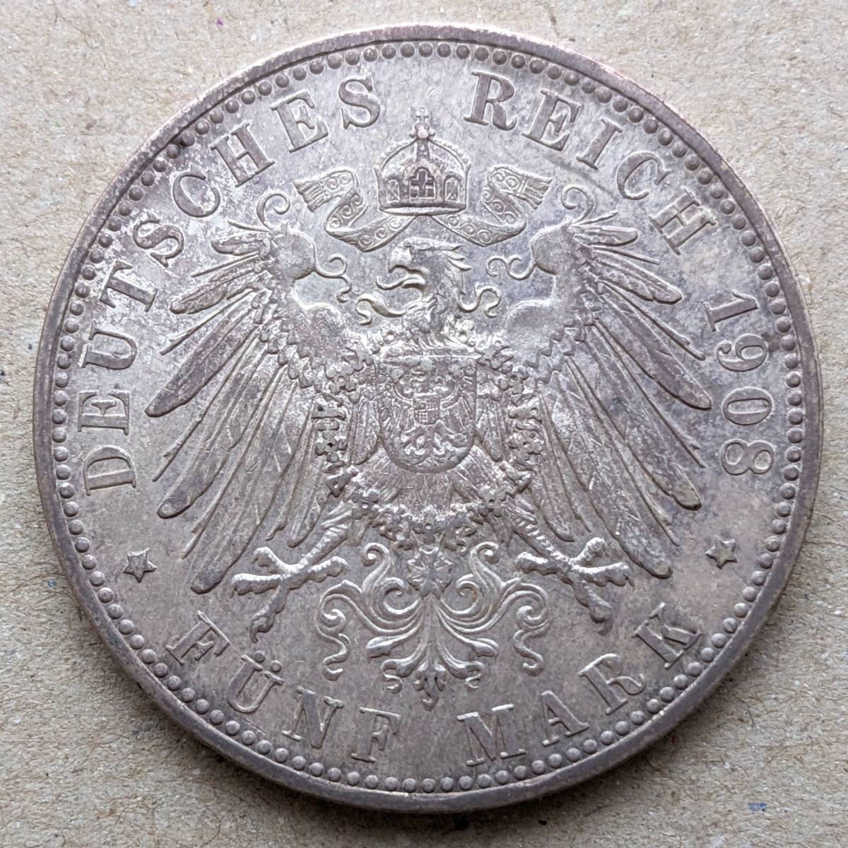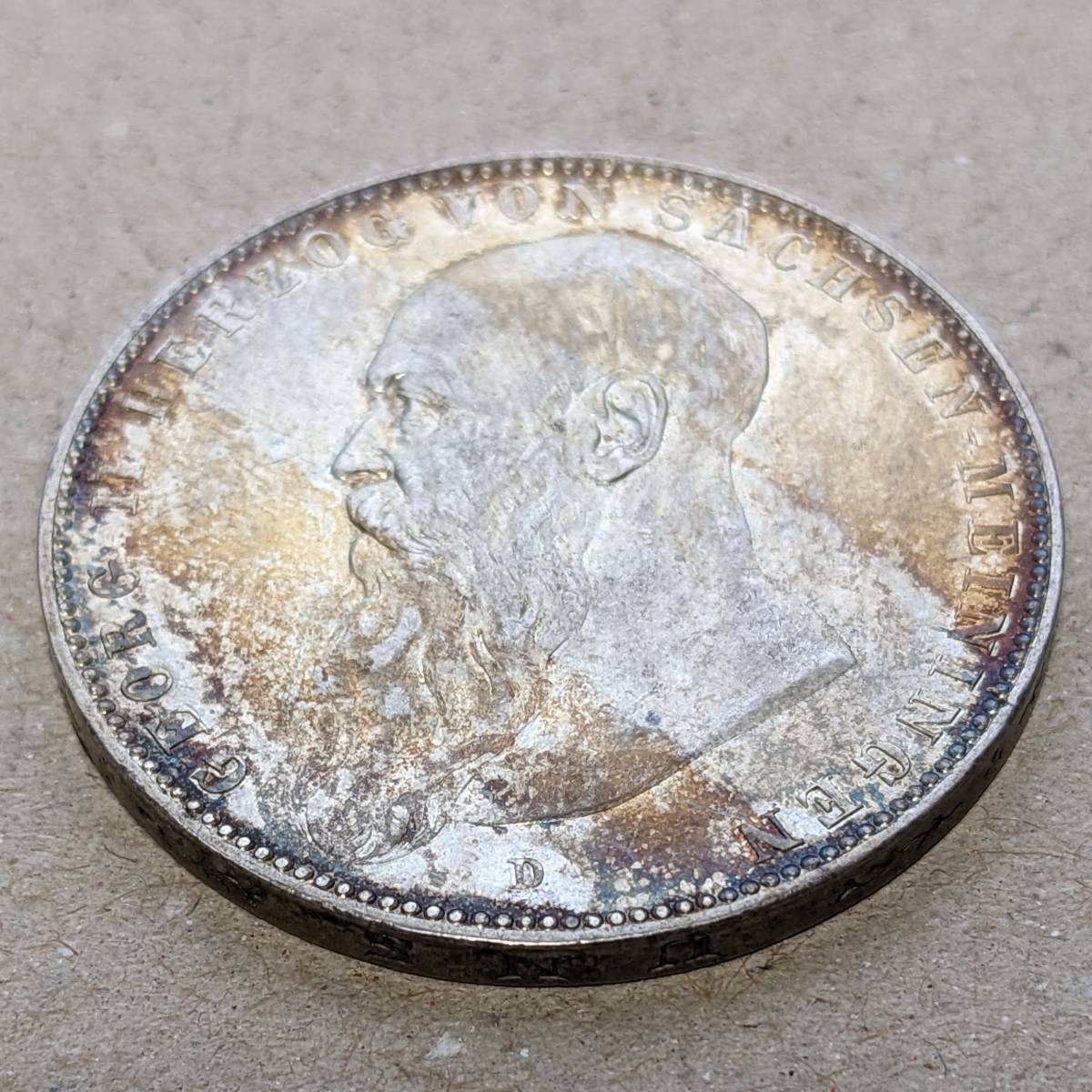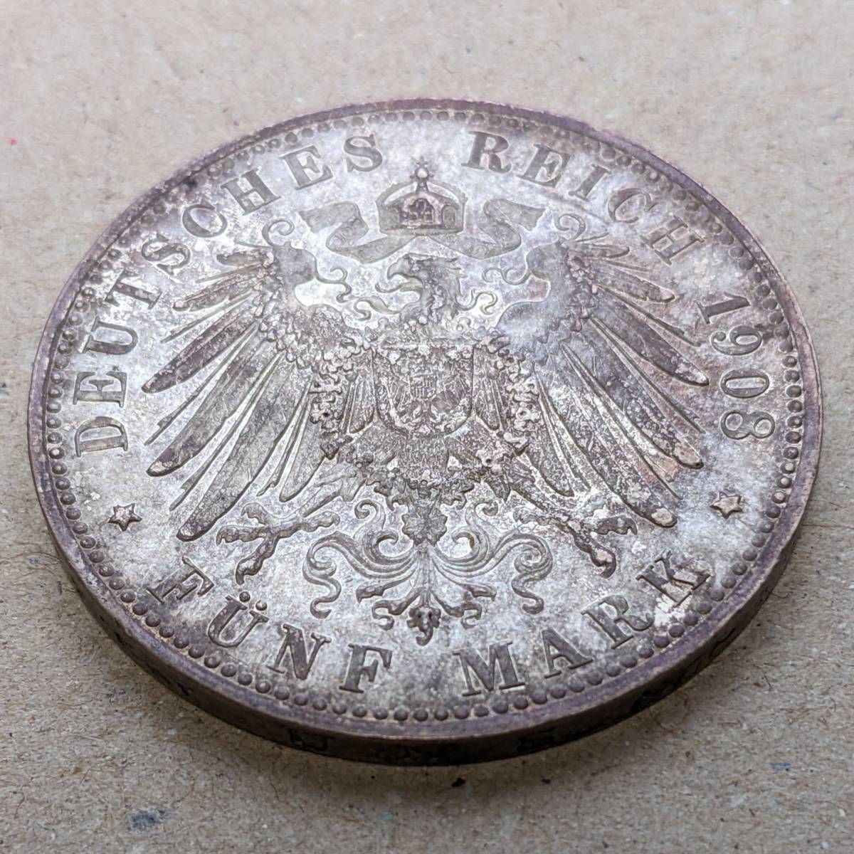 1908年 ドイツ ザクセン マイニンゲン ゲオルク2世 ショート顎髭 5マルク 銀貨 VF ミュンヘンミント