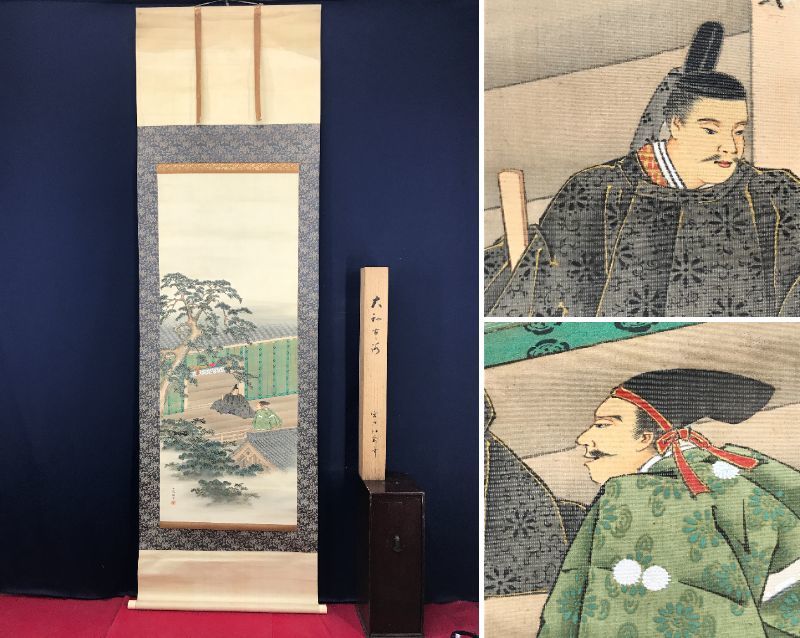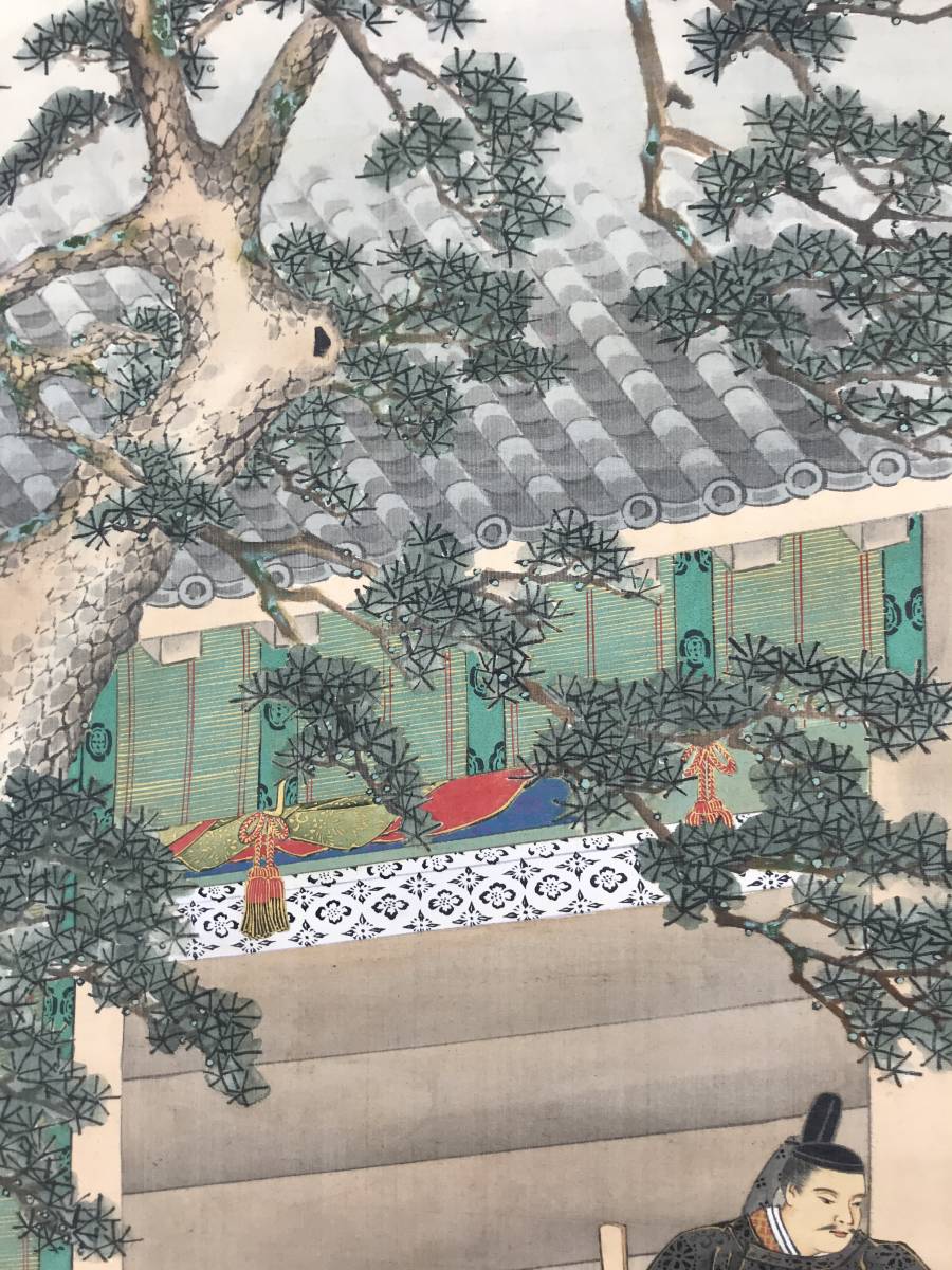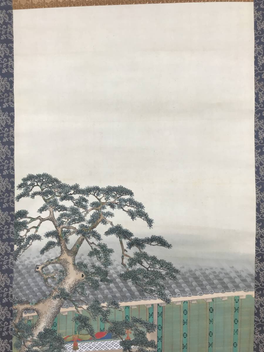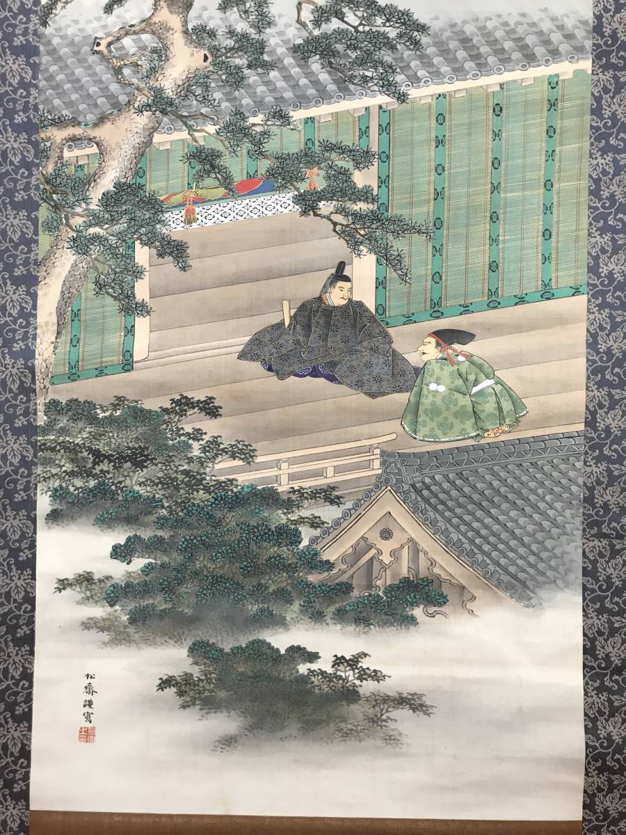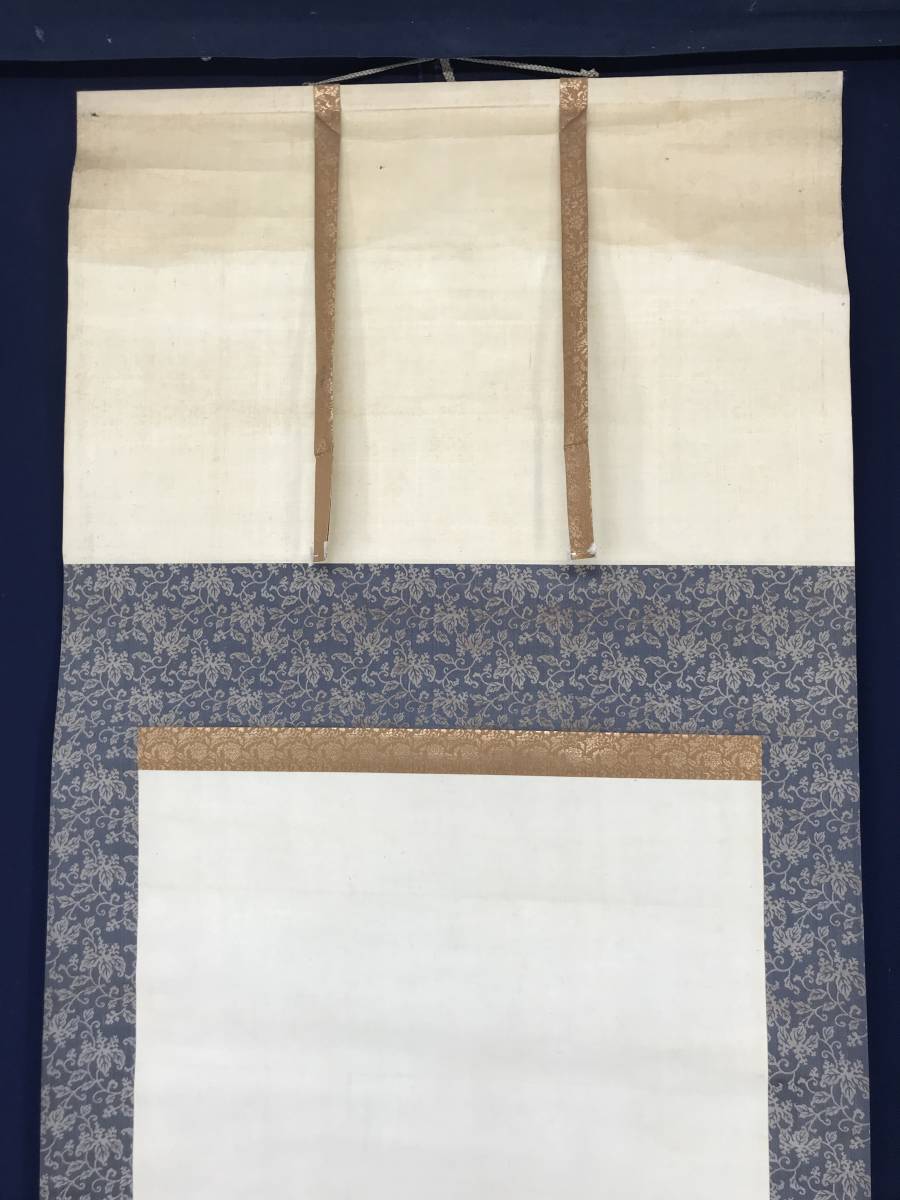 【作品状態】 本紙は絹本肉筆です。本紙は薄汚れ、多少の糊シミ、あります。表装は天地に多数の汚れシミ、糊シミ、巻シワなどあります。