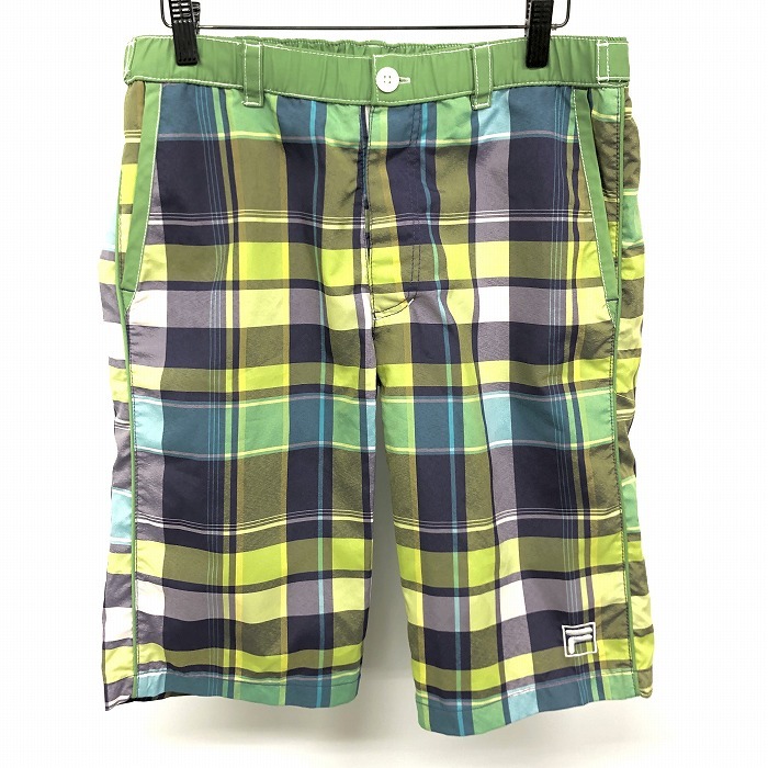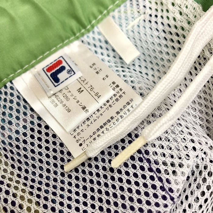 商品タイトル | FILA フィラ M メンズ 水着 スイムショーツ ショートパンツ ハーフ チェック 前立てがベルクロ ウエストにゴムと紐 ポリ100% 緑×紫×青 |