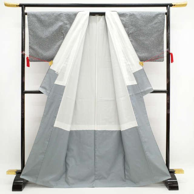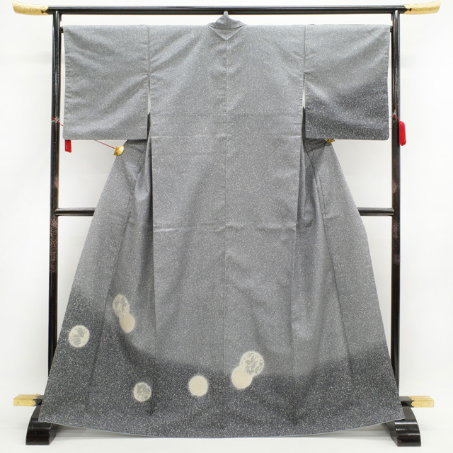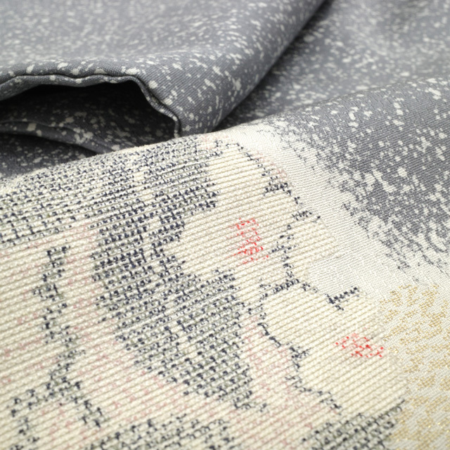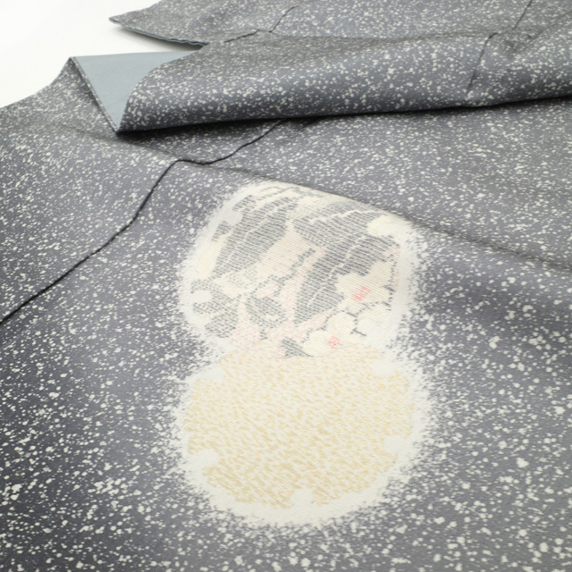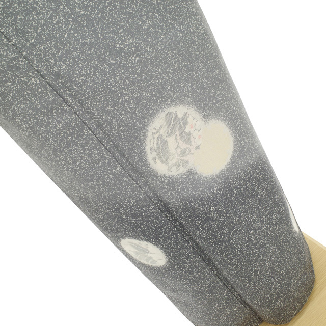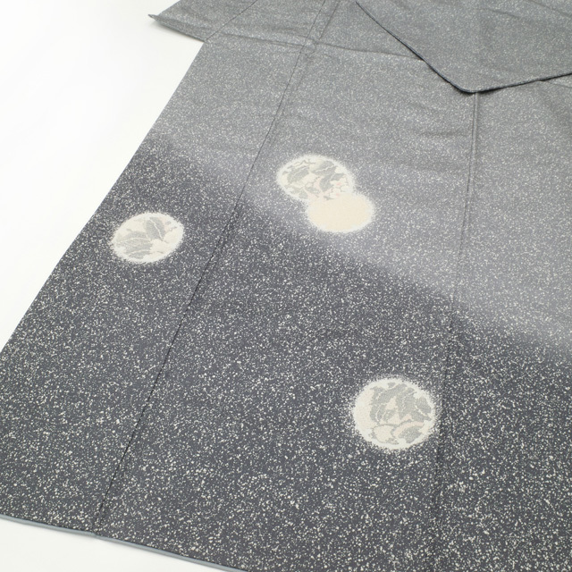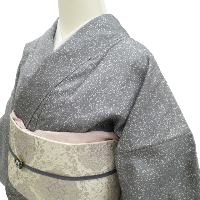 こちらのお着物は、ライトグレーから裾に向かったグレーにぼかされ、撒き糊散らしの柄が施された地が素敵。