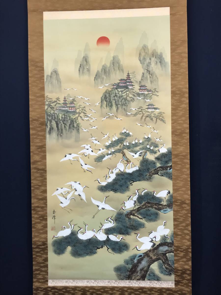 真作/玉峰/百鶴蓬莱山図/祝事山水図//掛軸☆宝船☆AC-57