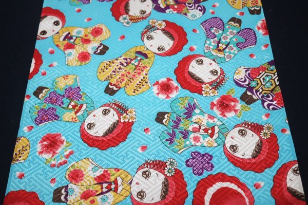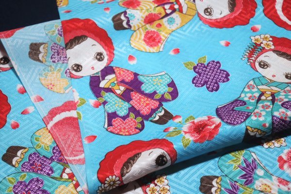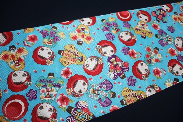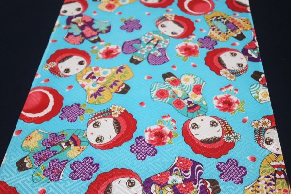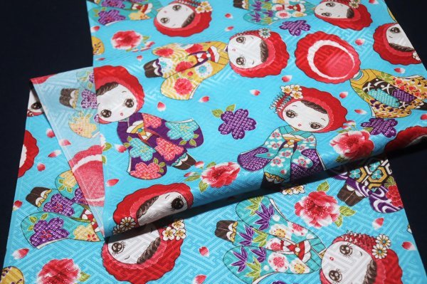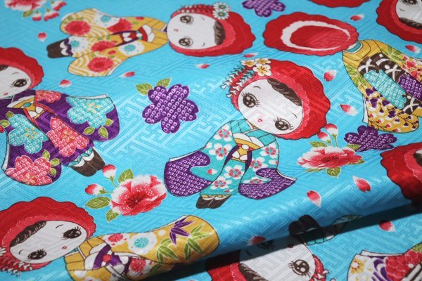| 【京わぎれ】正絹 友禅染はぎれ お人形柄 ブルー地 サヤ型柄地紋 軽め紋綸子生地 1.85m | ||||