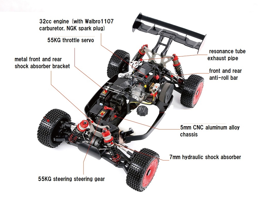 1/5Baja最大の特徴は2サイクルガソリンエンジンの採用。ダイナミックなエンジン音や走行音は電動モーターラジコンでは得られません。 通常のガソリンエンジンと2ストローク用オイルの混合ガソリンを使用。 その為ランニングコストはとてもリーズナブル。 本格的な走行の前にエンジンの慣らしを行ってください。必ず本体バッテリ―や送信機をオフにして、エンジンを点火。 点火後BAJA本体を持ち上げタイヤが接地出来ない様にセット、15分から20分アイドリングさせてください。エンジンはバッテリー充電しなくても点火します。 初めての方はエンジン点火方法などお問い合わせください。 配送品 <走る為のすべての部品が揃ったセット> 1/5Baja 本体(受信機・サーボ)送信機 専用ガソリンタンク 取扱説明書 その他 Bajaエンジン燃料はホームセンターなどで販売される草刈り機・チェーンソーの2サイクルエンジン燃料もご使用になれます。 1, 32cc engine (with Walbro1107 carburetor, NGK spark plug) 2, LxWxH: 830X500X330mm 3, track 440mm 4, wheelbase 550mm 5, 4WD four-drive transmission 6, double disc brake 7. Front CVD drive half shaft and rear shaft head drive shaft 8. Short drive shaft before power output, rear drive shaft 9, 55KG throttle servo 10, 55KG steering steering gear 11, 2.4G remote control 12, resonance tube exhaust pipe 13, metal differential (front, middle and rear three differential system) 14,8000 rpm wear clutch 15, metal clutch cup support cover 16, metal differential bracket 17, 7mm hydraulic shock absorber 18, metal front and rear shock absorber bracket 19, small nails (sealed frame) 20, 5mm CNC aluminum alloy chassis 21, front and rear anti-roll bar 22, PC car shell 23, repair kit 24, matching pot |