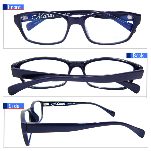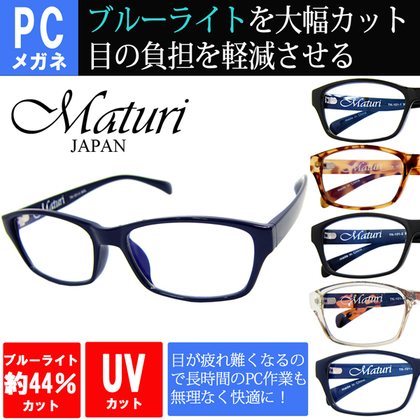 PC用メガネでブルーライトを44.1%カット! ブルーライトの影響により、眼病や体内のリズムを狂わせ様々な障害をもたらす恐れがあると問題視され、テレビや雑誌でも多数取り上げられてきています。 パソコンやテレビ、スマートフォンなどの液晶ディスプレイにはバックライトとしてLEDが使用されていて『ブルーライト』と呼ばれる眼には見えない青い光が発せられています。 『ブルーライト』は光のエネルギーが強いため、長時間見続けるとまふしさを感じたり、視界がチラつき、眼精疲労、ドライアイ、肩こり、視力低下の原因になります。 そんなブルーライトからあなたの目を守るために「Maturi PC」は誕生しました。 眩しさやちらつきを低減させ、眼を疲れにくくするので、ブルーライトを発する長時間のパソコン作業やスマートフォン、液晶テレビ、ゲーム機などの操作も無理なく行うことができます。 ■カラー:フレーム/バイオレット、レンズ/クリア ■サイズ:(約)レンズ横5.4cm×縦3.5cm、フレーム幅(外側)14cm (実寸につき誤差はあらかじめご了承ください) ■素材:レンズ/マルチコート加工、紫外線UVカット約99%、フレーム/プラスチック ■ブルーライト約44.1%カット ■可視光線透過率:90% ■紫外線透過率:1.0%以下 ■付属品:Maturiメガネケース ■新品・未使用 ■定価:6500円 【注意事項】 ※本製品はパソコンや携帯電話等のディスプレイ用メガネです。パソコンや携帯電話等のディスプレイを見る時以外は本製品を外して下さい。 ※失明や視力低下の恐れがあるため本製品を着用した状態で太陽等は見ないで下さい。 ※ご覧のモニターやプラウザの設定、照明等により、画像と実物の色合いが、若干異なる場合が御座います。 ※製造上の過程により商品によっては細かな傷がある場合が御座います予めご了承下さいませ。 | |
