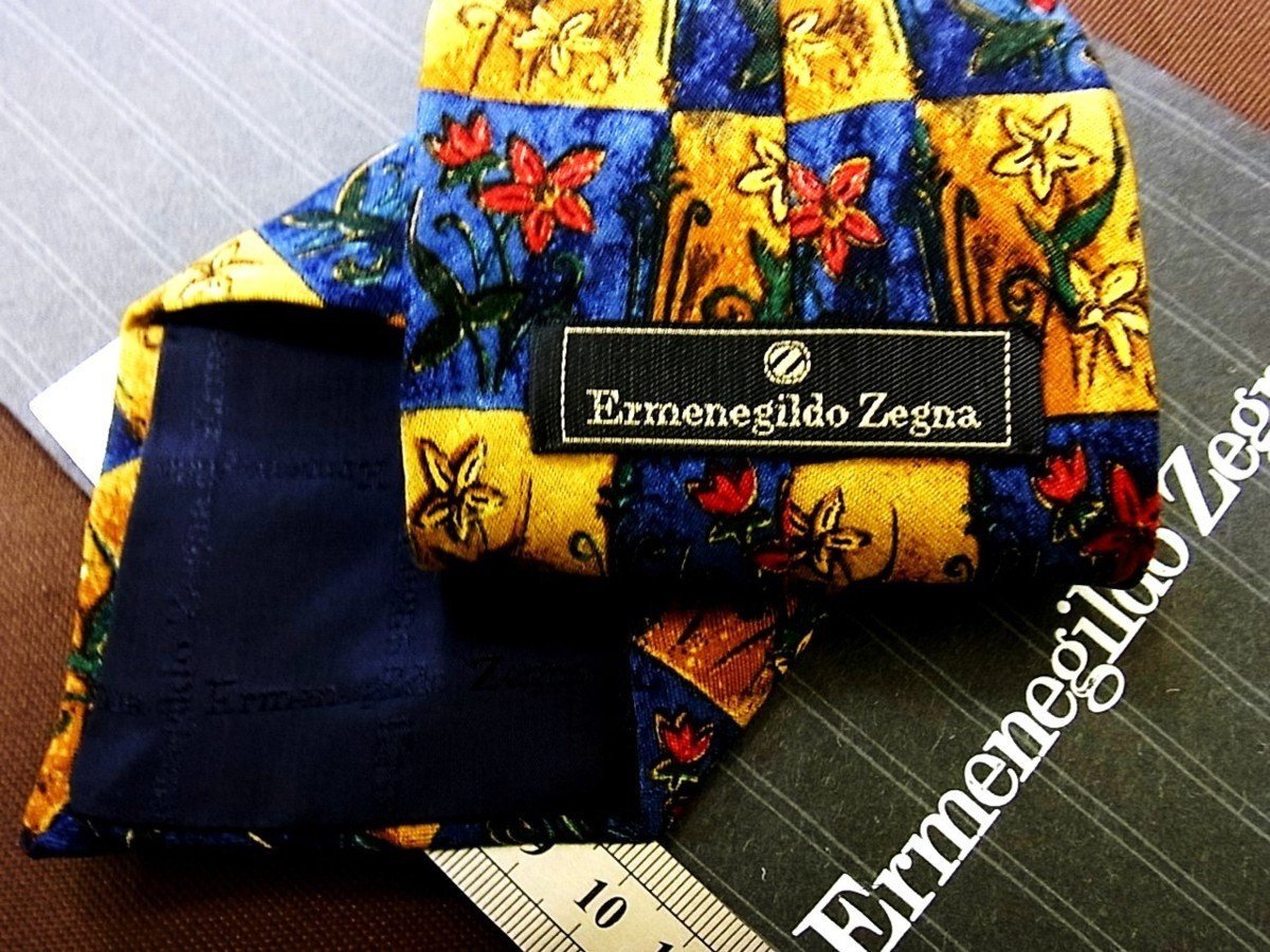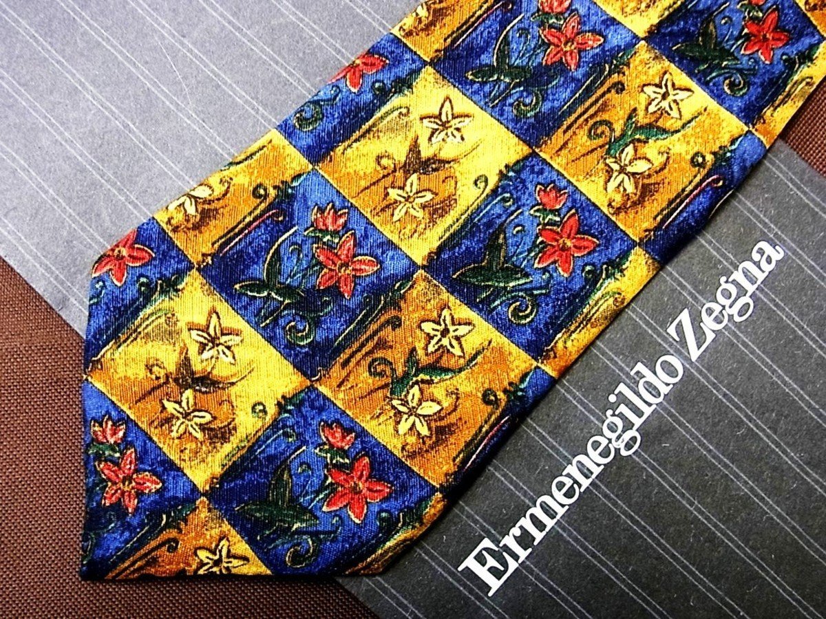 ♪24362C♪良品【花 植物 格子 柄】ゼニア【Zegna】ネクタイ