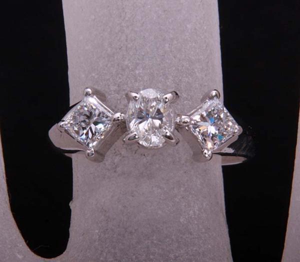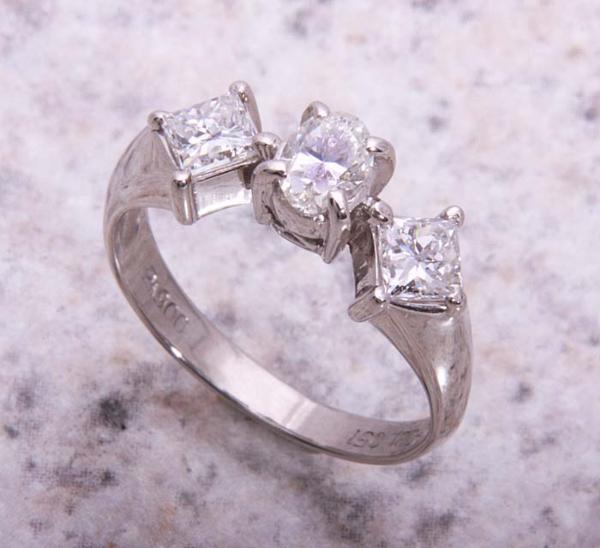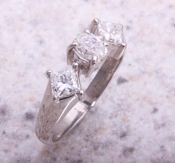 両側にはプリンセスカットダイアが輝くデザインリングです。