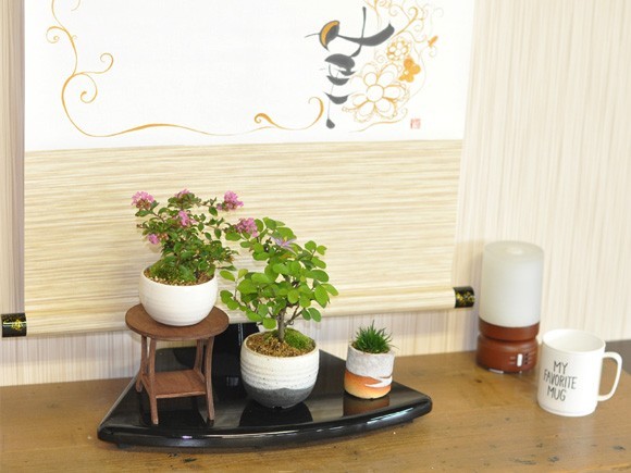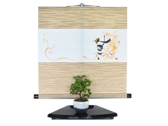 飾り台(扇型)にかける軸 華を掛け、盆栽を置いたイメージです。