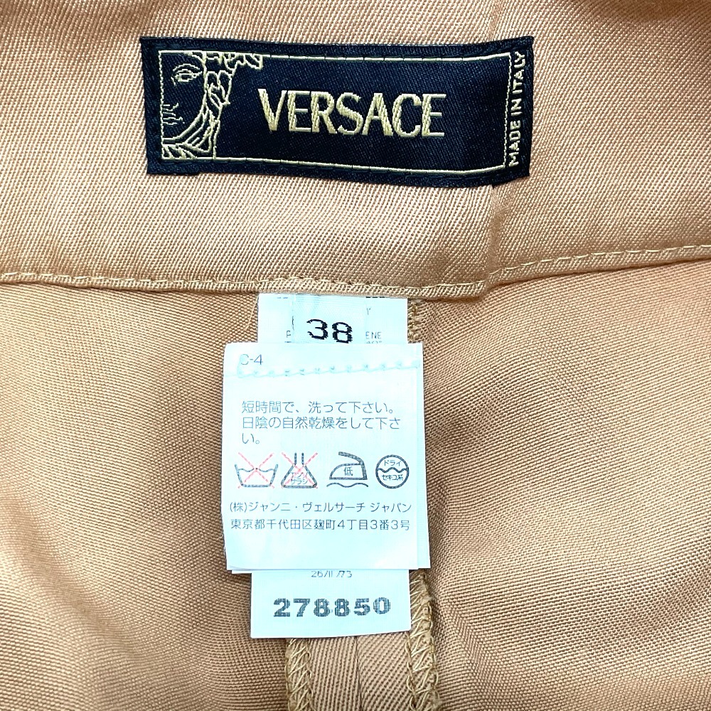 商品説明VERSACEの上品なワイドパンツです。カラーは絶妙な色合いのブラウンベージュで、優しい色味のブラウン系になります。スタイルが良く、足長効果の人気のワイドパンツ。どんなスタイルにも合わせやすいおススメのアイテムです。