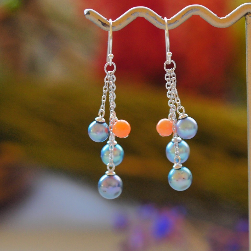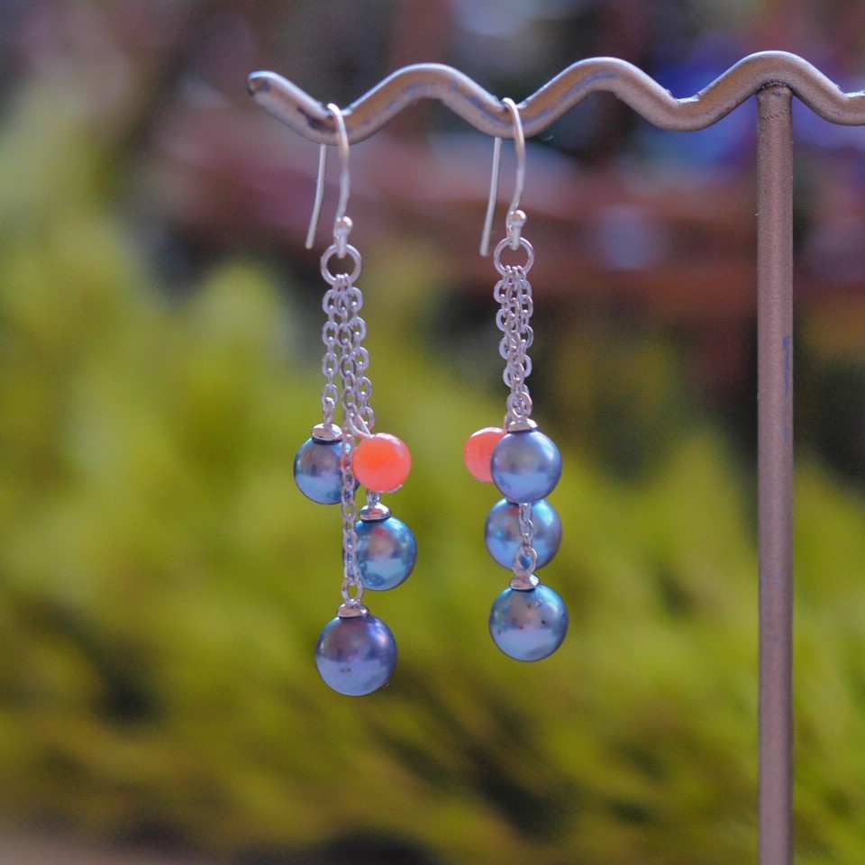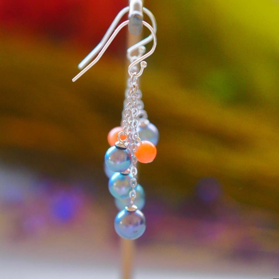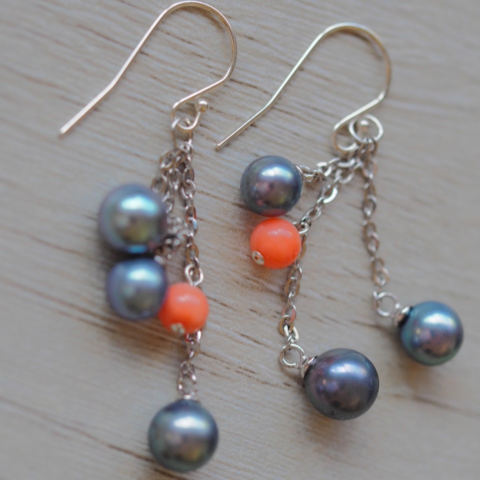レッド~グレー、ブラックの色彩の移ろいがピンク珊瑚にアコヤパールのピアスです。