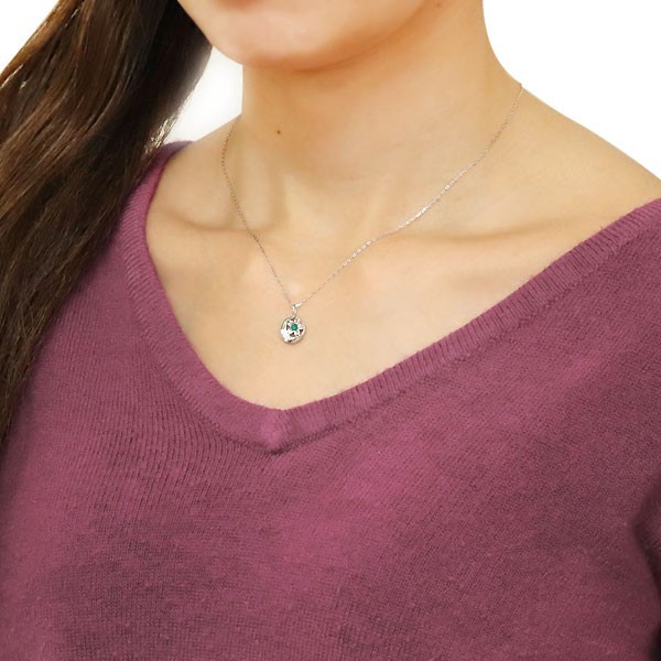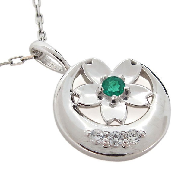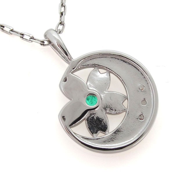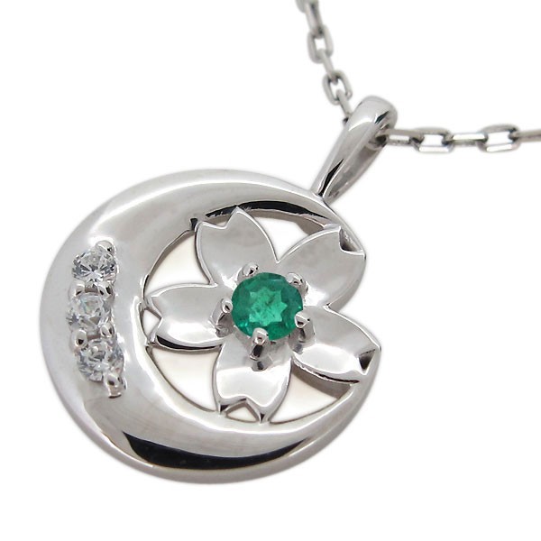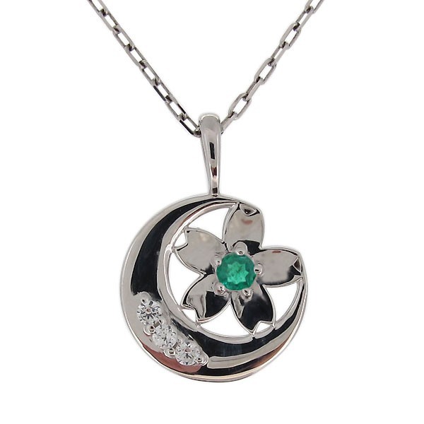 5月誕生石エメラルドを使用したプラチナ製の、桜(フラワー)と三日月(ムーン)モチーフレディースネックレス(ペンダント)です。