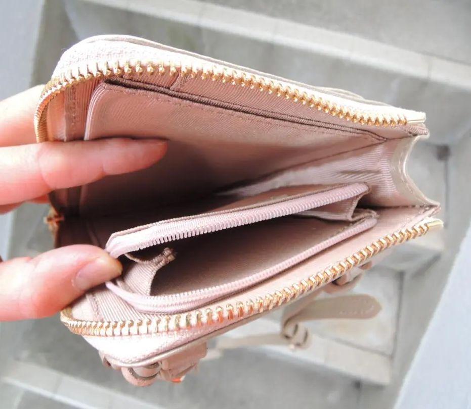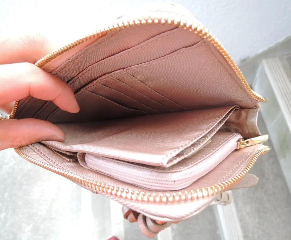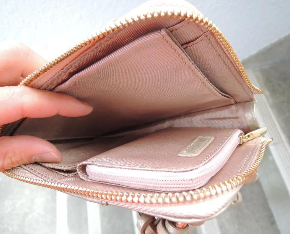 中はとっても多機能です。 ファスナーのコインポケット、その下にオープンポケット1個、 お札フォルダー、カード入れ4枚分、その裏にオープンポケット2個 あります。
