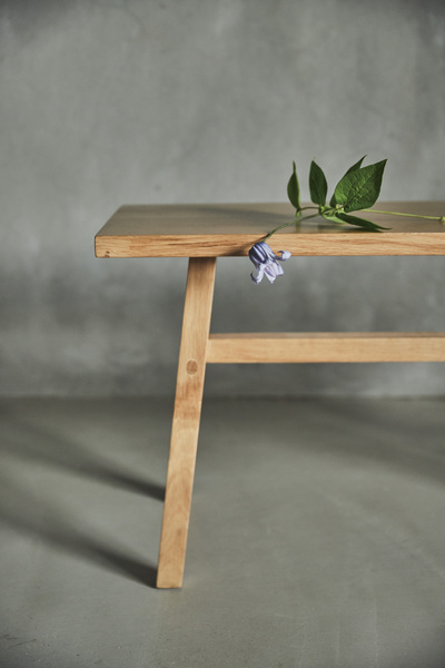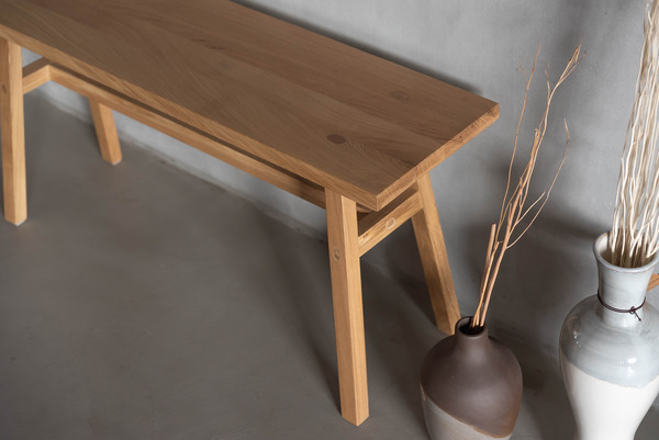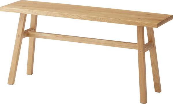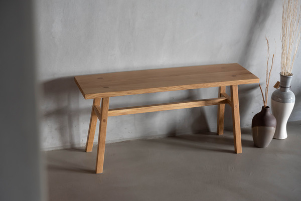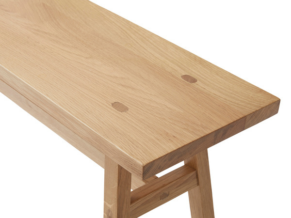 ホワイトオークの素材感を感じられる、シンプルなデザインのウッドベンチ。