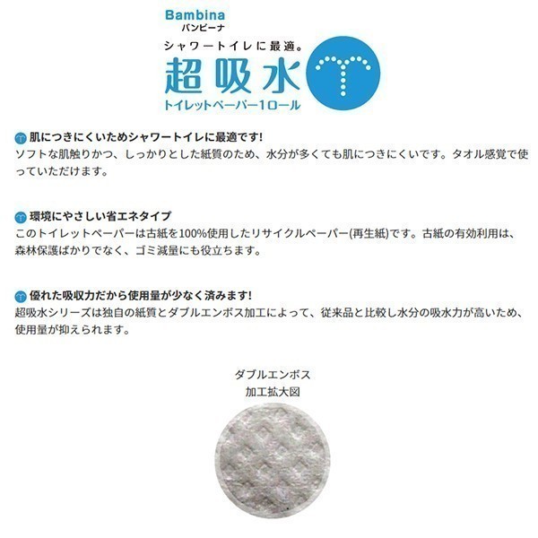 | 富士山の湧水を使用したトイレットペーパー 温水便座用のトイレットペーパーとして最適です しっかりとした紙質のため水分が多くても肌に付きにくい仕様です 独自のダブルエンボス加工で吸水力を高めました 吸水力が抜群なため少な目に巻き取って使えるエコタイプ 【商品詳細】 ロールサイズ:114mm×18m ダブル(2枚重ね 120カット) ケース入数:4ロールX30パック(120個) ミシン目:有り 色・表面:白・ダブルエンボス加工 紙の材質:再生紙100% 枚数:ダブル ケースサイズ:520×575×高さ465mm ケース重量:11kg 梱包方法:4個手付け袋入 用途:業務用・家庭用・贈答用・販促用・イベント用 製造メーカー:林製紙株式会社 型番:1142 |