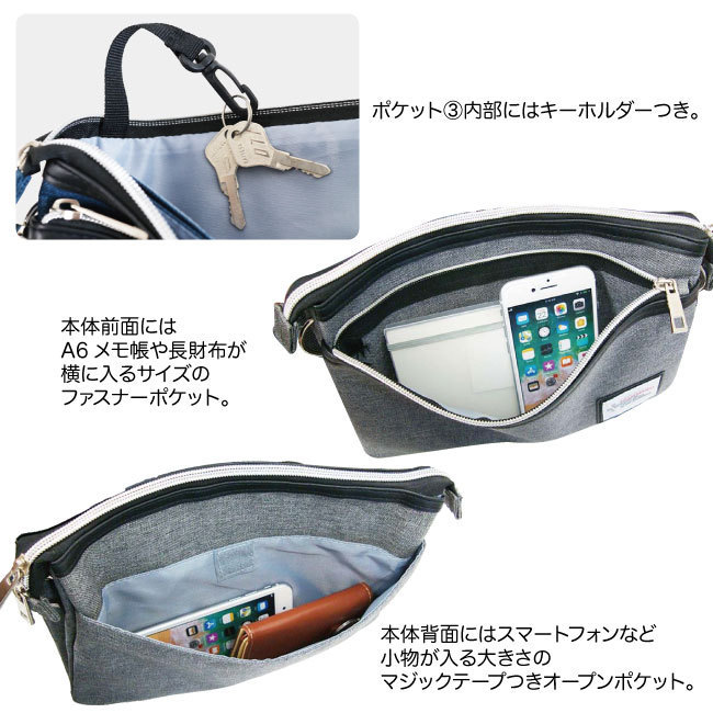 | 薄型コンパクトで5つのポケットが付いた、機能的な2WAYミニショルダーバッグです。内部は分類収納出来る3室式になっており、使い勝手GOOD!鍵などを付けられるキーストラップ付き。低価格でコスパもGOOD!散歩やお買い物など、ちょっとしたお出掛け、普段使いにオススメ!男女問わずお使いいただけます。
