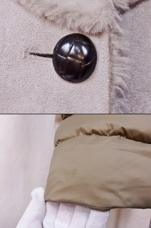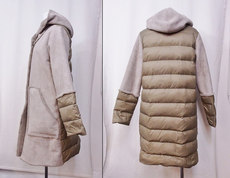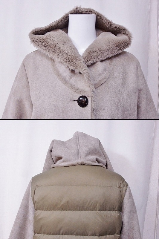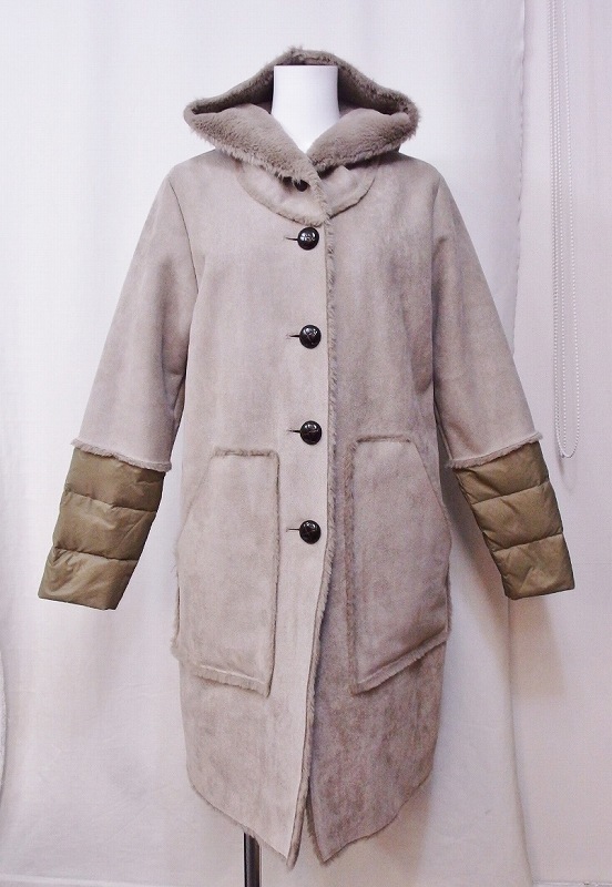 商品説明 | フェイクムートン×ダウンの異素材使いのNerineのコート。 柔らかいベージュ系で上品に、ちょっと面白いデザインのコートです。 フードの内側、前身頃の内側は柔らかいフェイクファー。 |