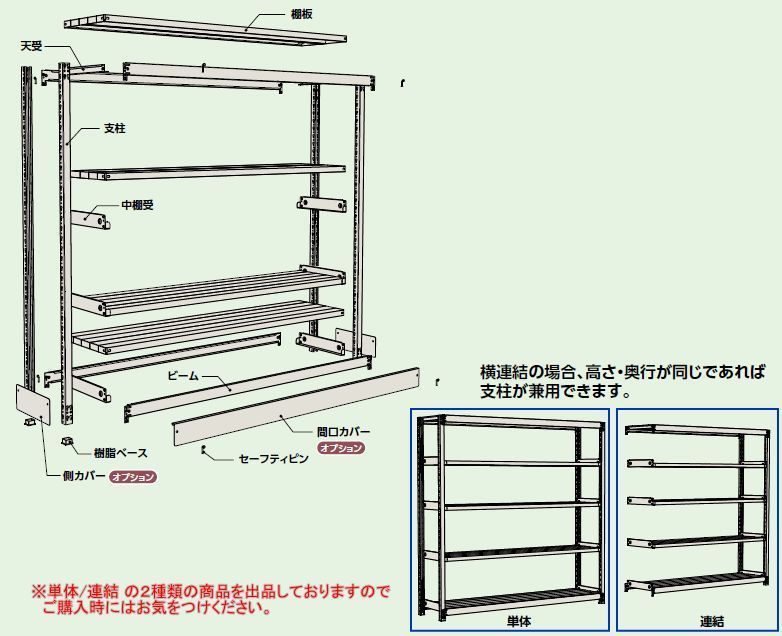 | ・別売りの連結棚を使用すれば棚の増設も容易です。 ※連結の場合、高さ・奥行が同じであれば支柱が兼用出来ますのでスペースを有効活用できます。 | ||||||||||||||||||||