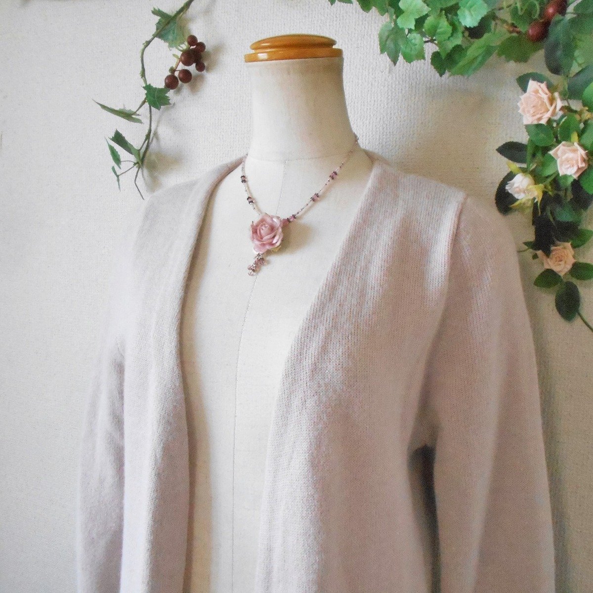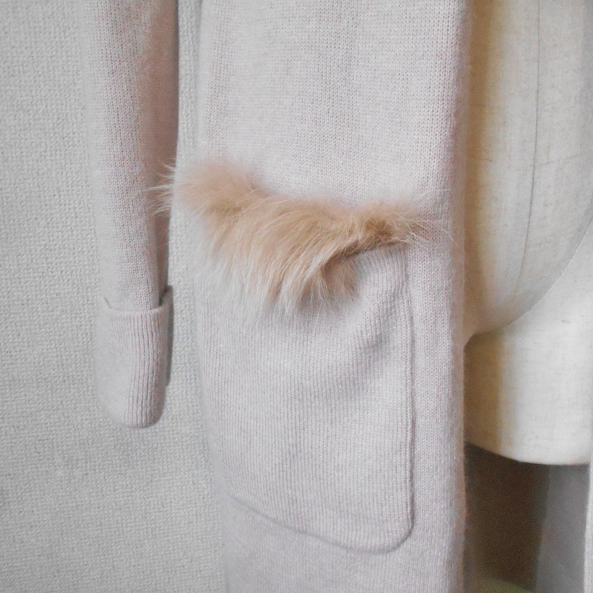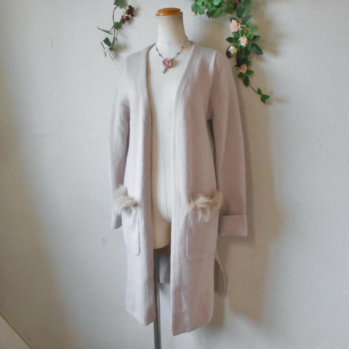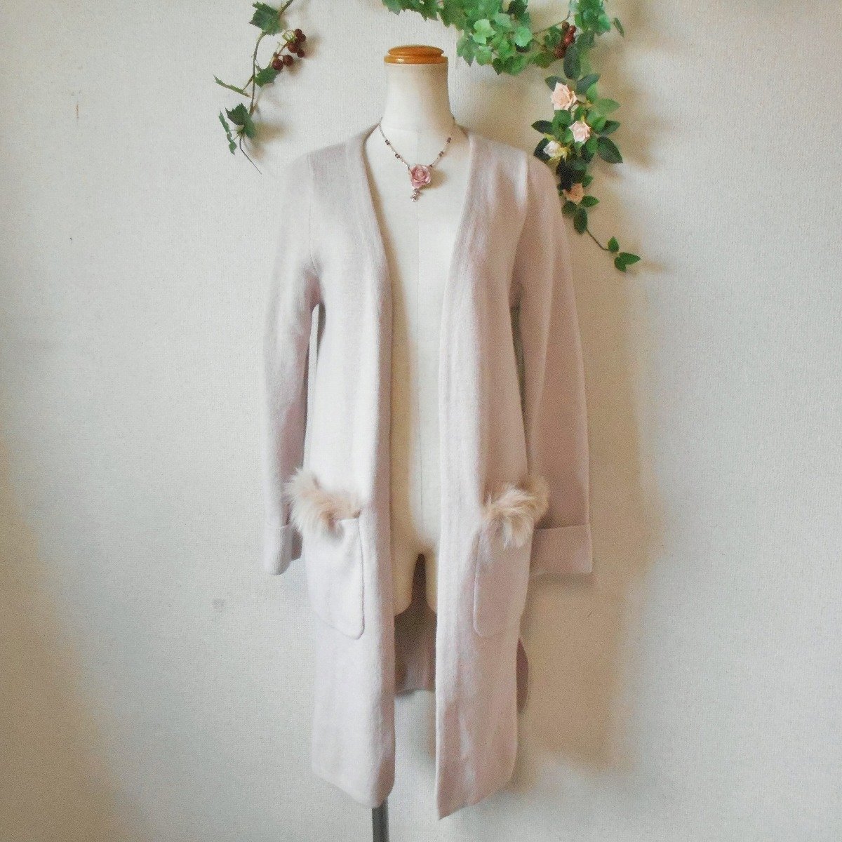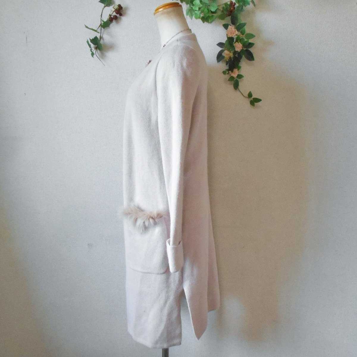 【ポイント】アプワイザーリッシェのロングニットカーディガンになります。お色はベージュ系で秋冬を中心に着ていただけるお品です。前はボタン等は無く羽織っていただくデザインで、ポケット部分にフォックスファーが付いた、とっても素敵な一着です。