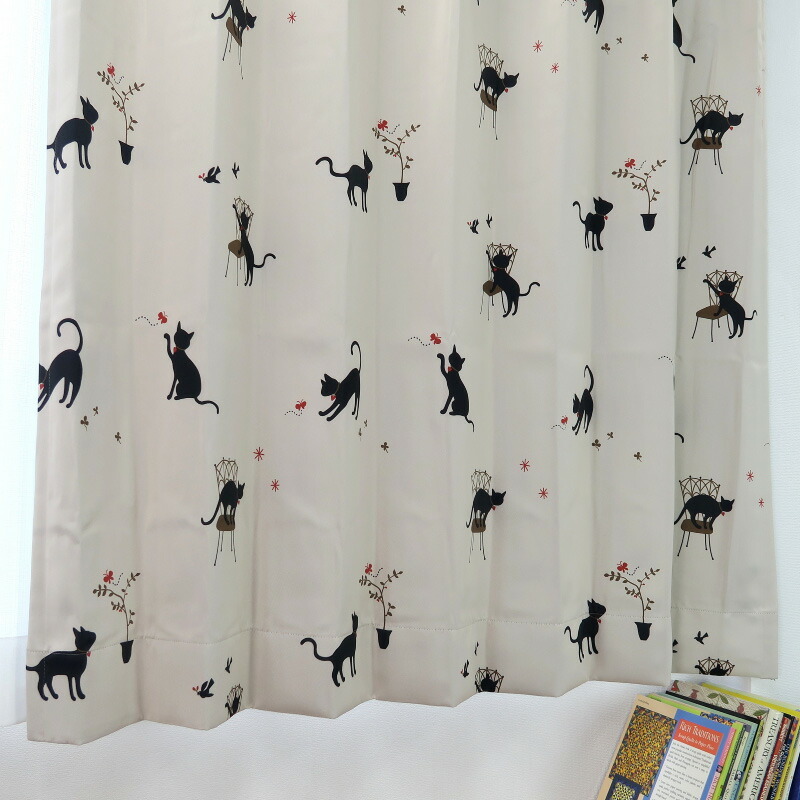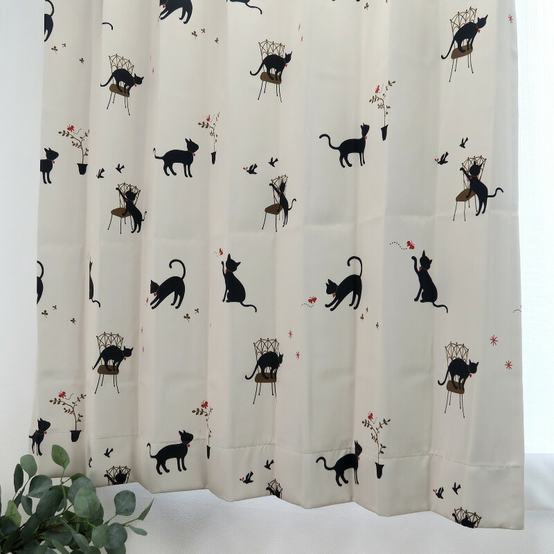 遮光カーテン かわいい猫柄 アイボリー 幅100cm×丈160cm2枚 日本製 プリーツが綺麗な形態安定加工