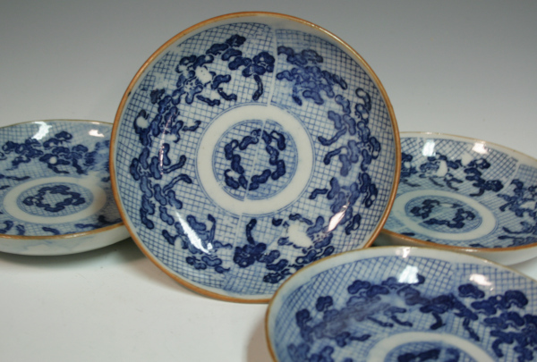 古伊万里、印判松文小皿、4客セットです。時代は江戸時代頃。縁には口紅(口銹)が施されています。4客のうち2客の高台内にトリアシ状のニュウが見えますが、表には通っていないようです。他、古いものですので、スレキズ、汚れ、フリモノ、釉切れ、くっつき、版ズレなどございます。状態の詳細は画像にてお確かめください。箱は付いておりません。お分かりの方、宜しくお願いいたします。