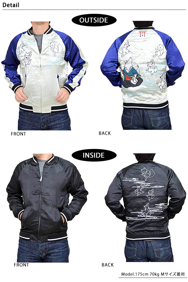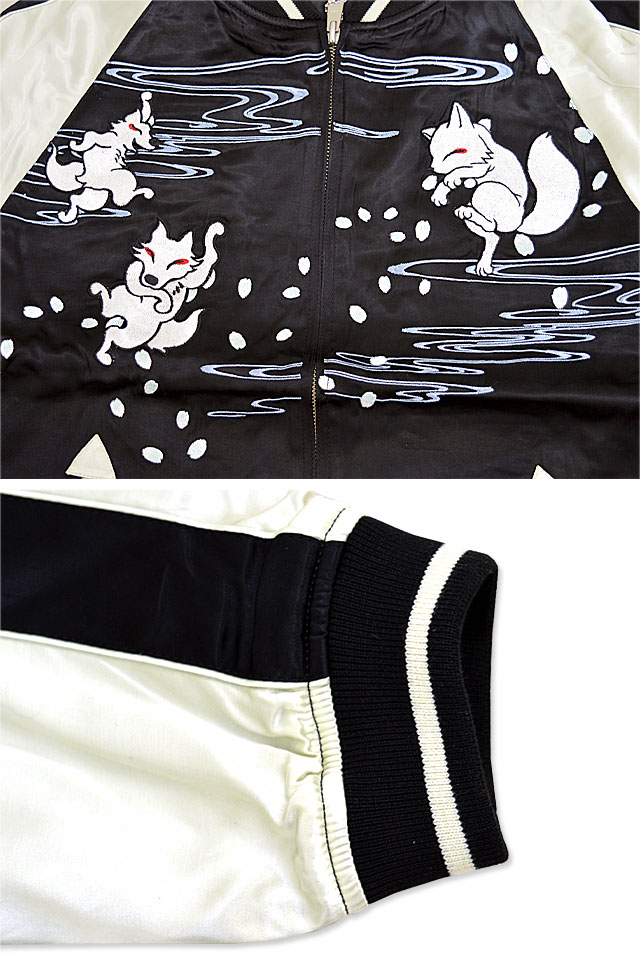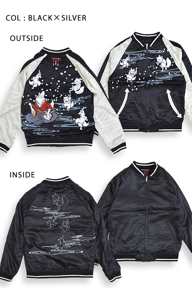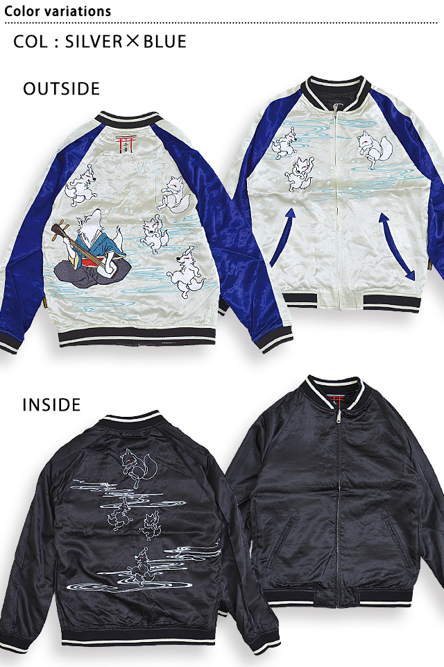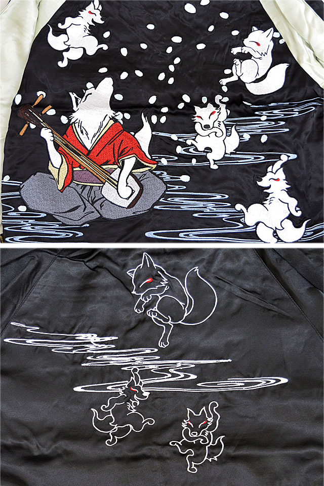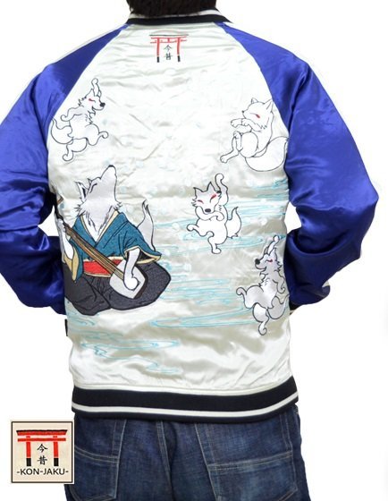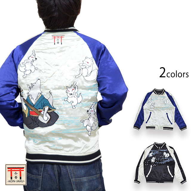 愛らしい狐のキャラクターが主役の【今昔】から「大演舞楽スカジャン(KJ-26006)」のご紹介です。 好評の総刺繍スカジャンから新作が登場! 今回は三味線に合わせて楽しそうに舞う狐達をモチーフにデザインしました。 ボディーにはレーヨンサテンを採用。 1枚持っているだけでずっと使えるアイテムです。  | ||||||||||||||||||||